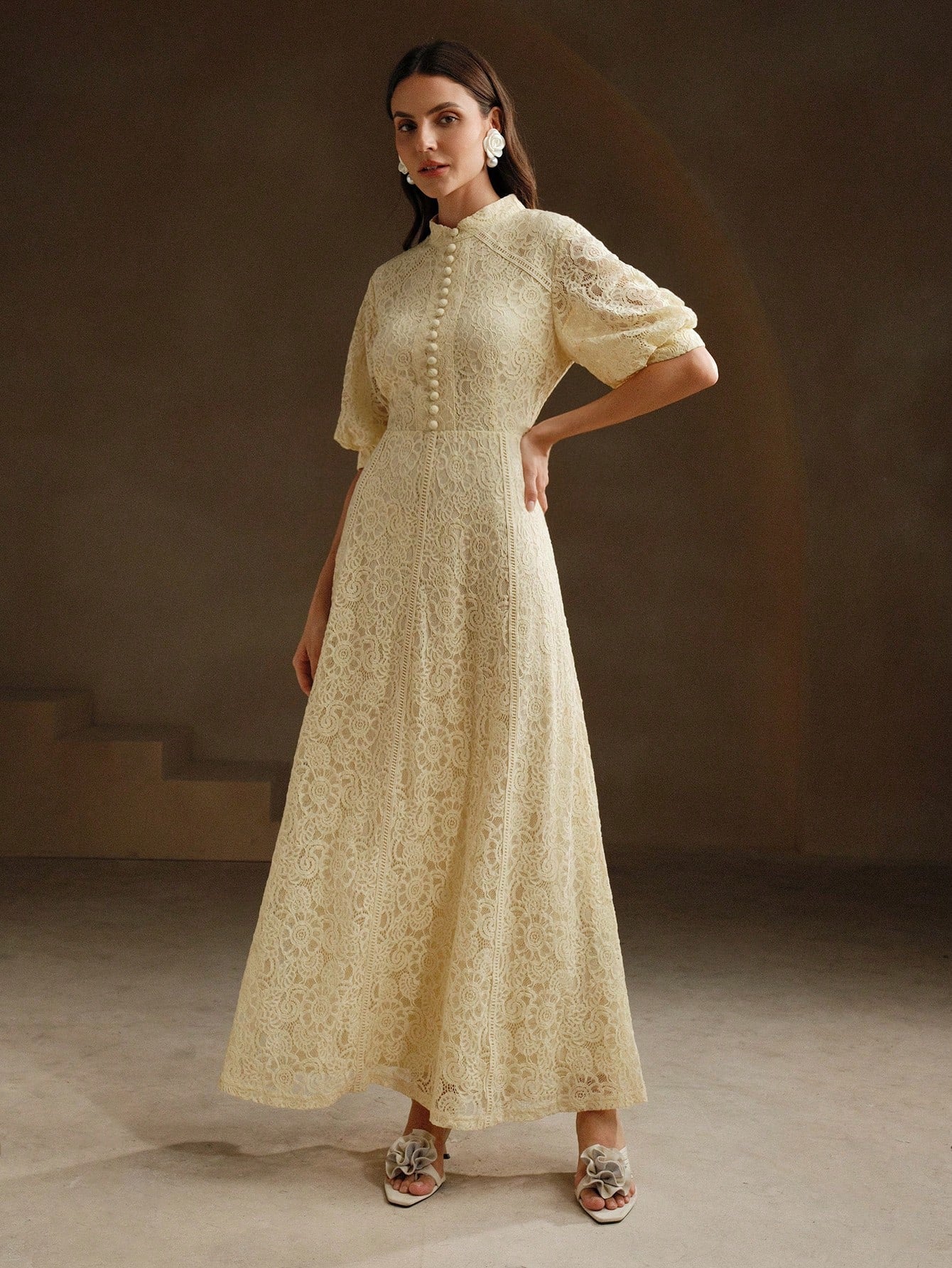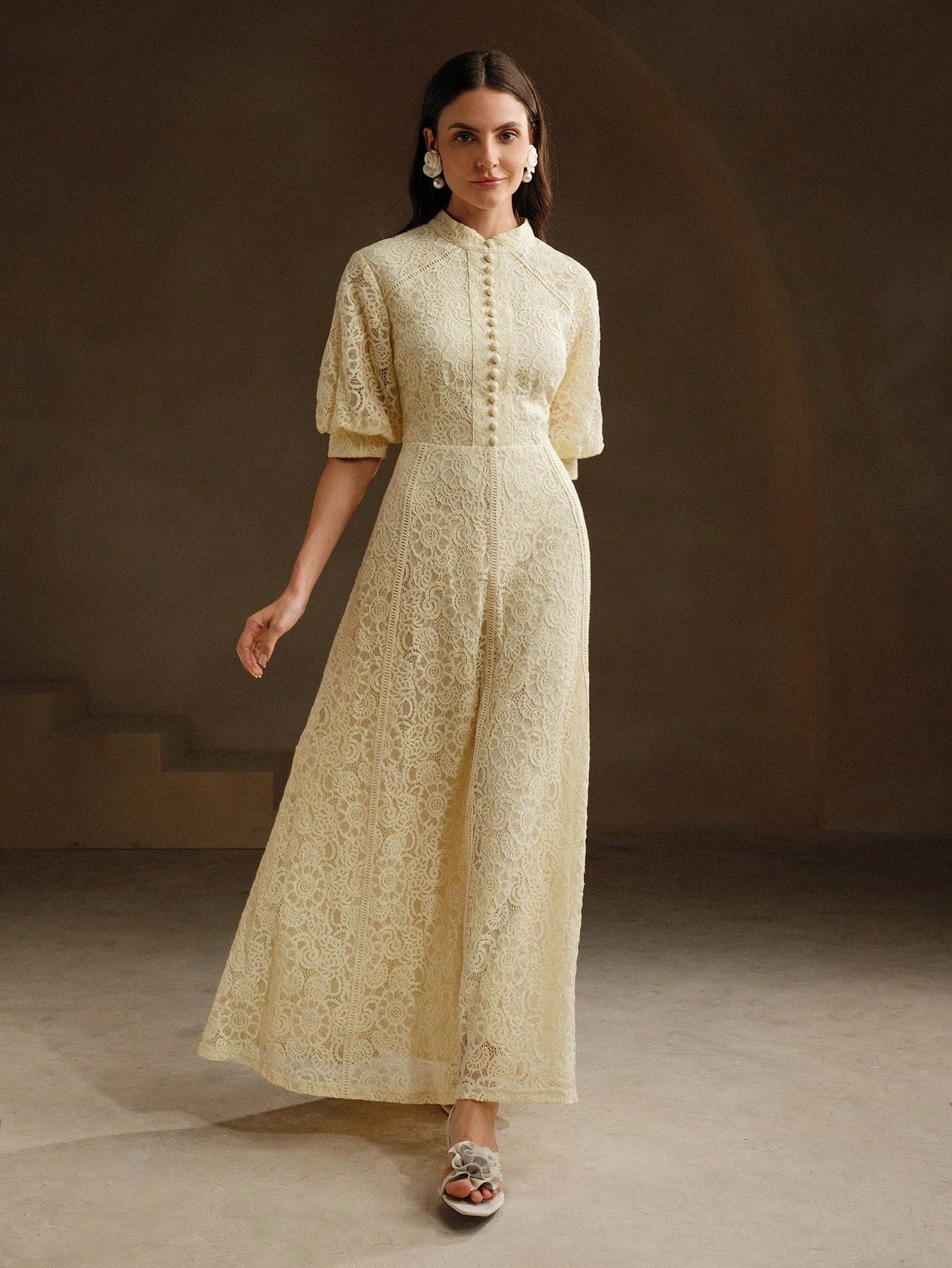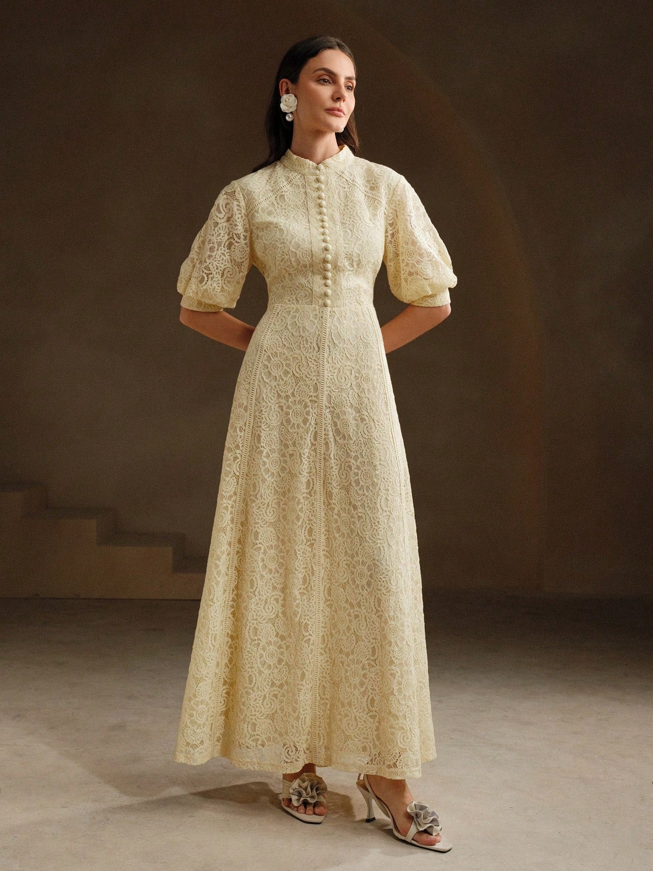 Anewsta White Slim-Fit Lace Short Sleeve Long Holiday Casual Dress