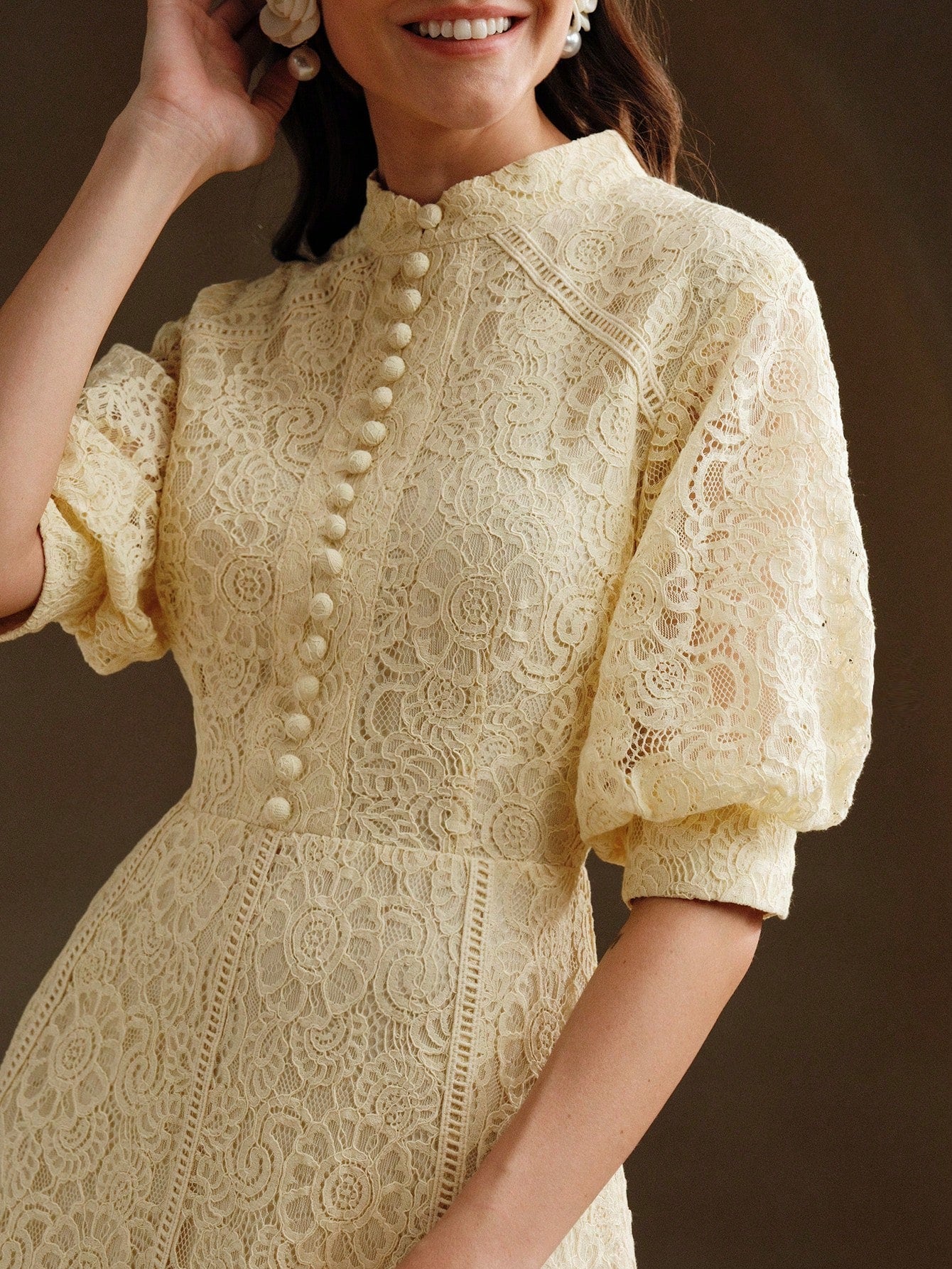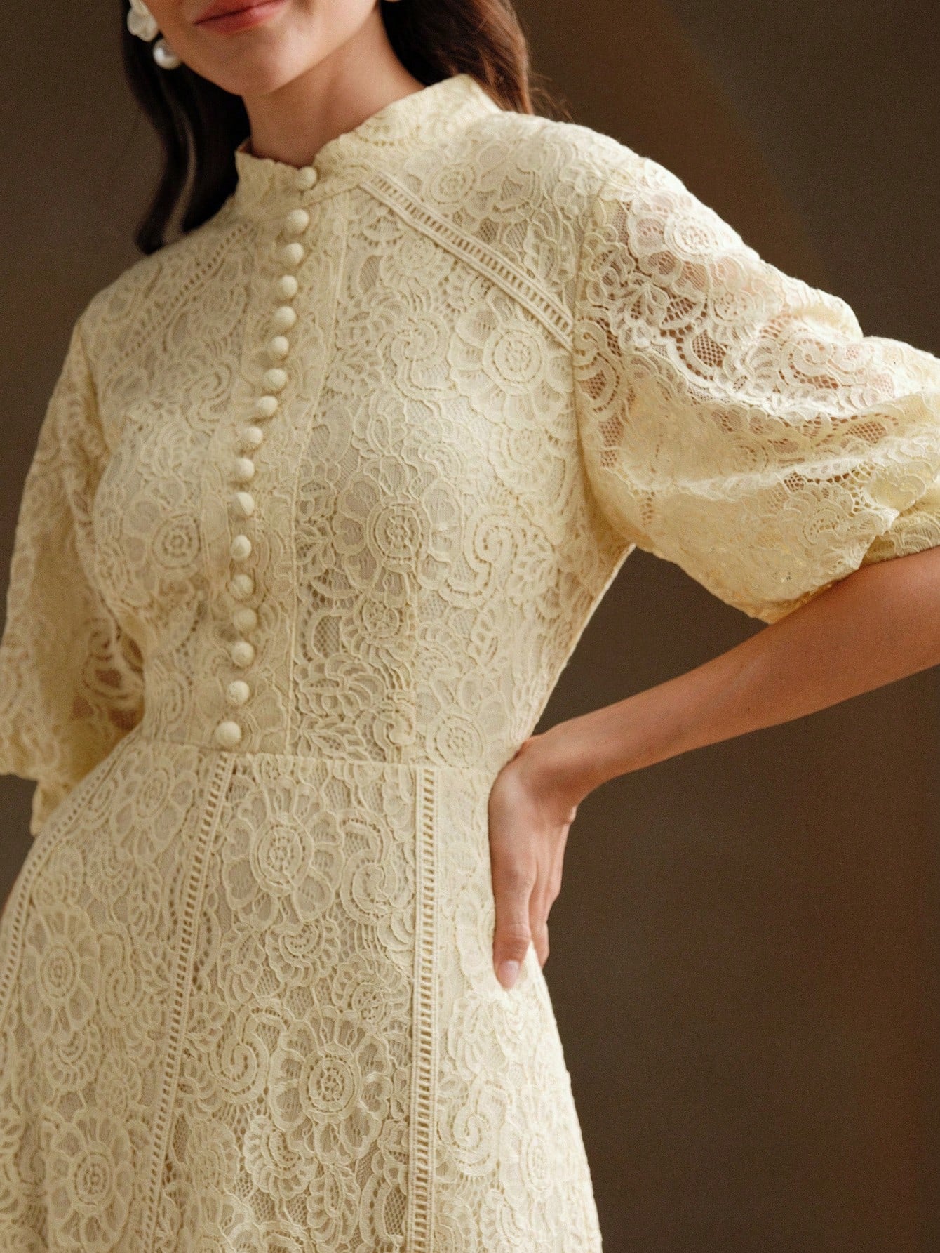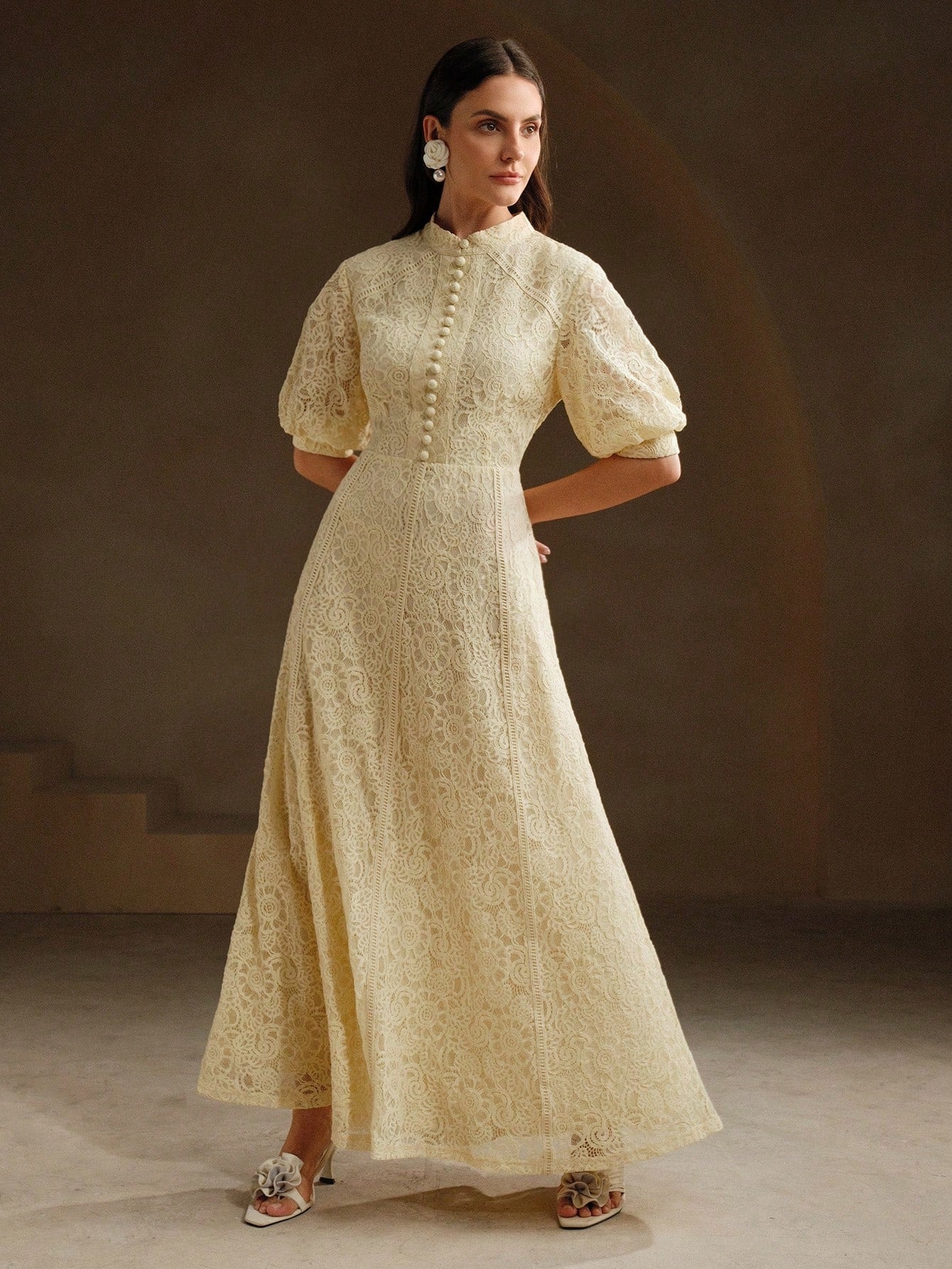 Anewsta White Slim-Fit Lace Short Sleeve Long Holiday Casual Dress
