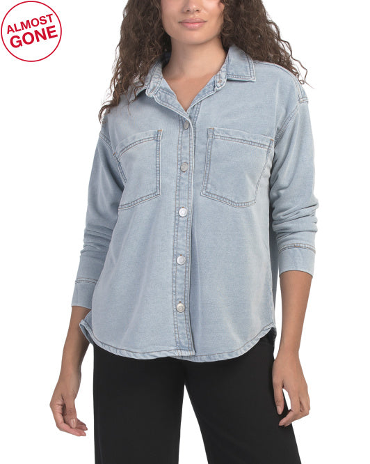 BEACH LUNCH LOUNGE Cotton Blend Knit Button Down Top With Denim Effect