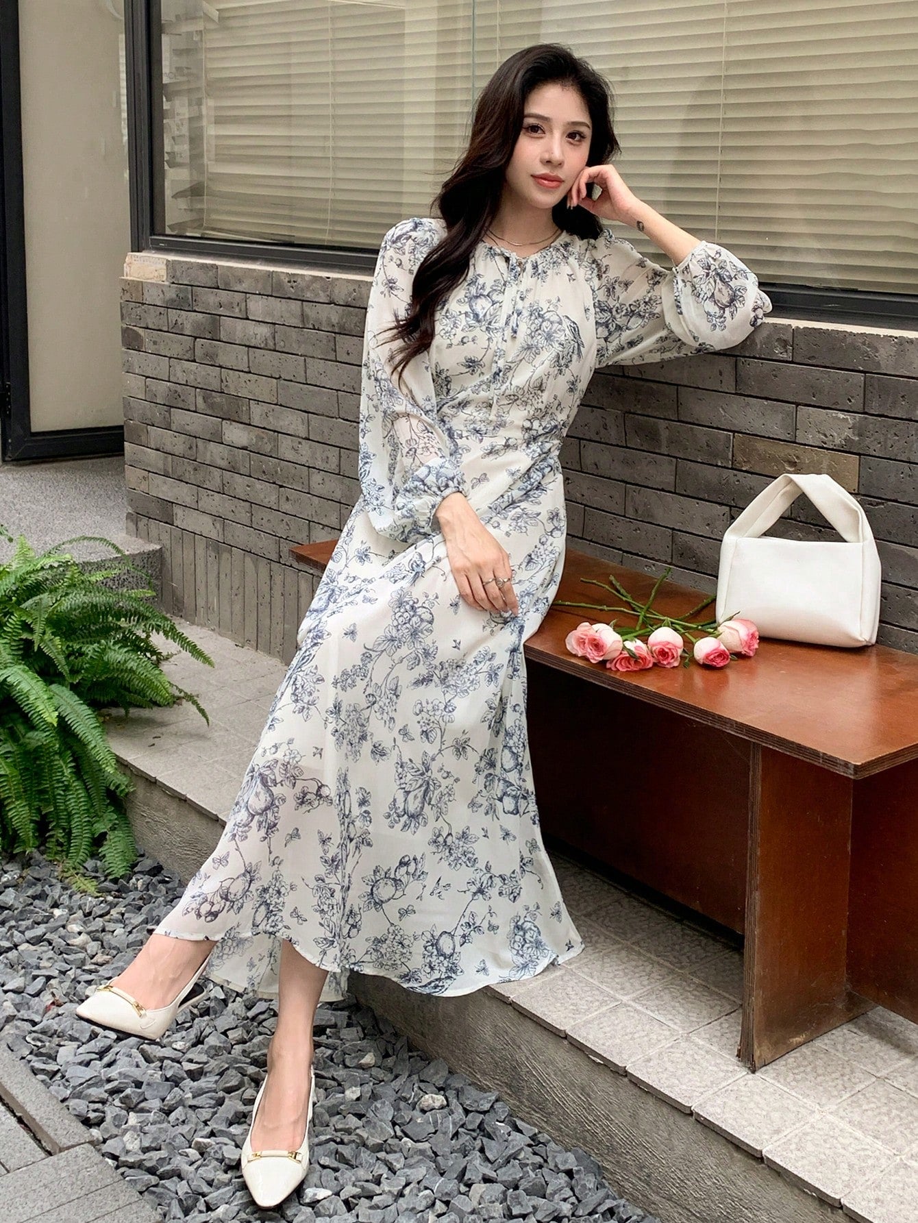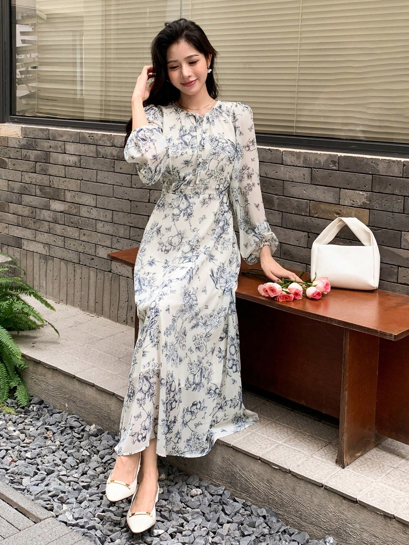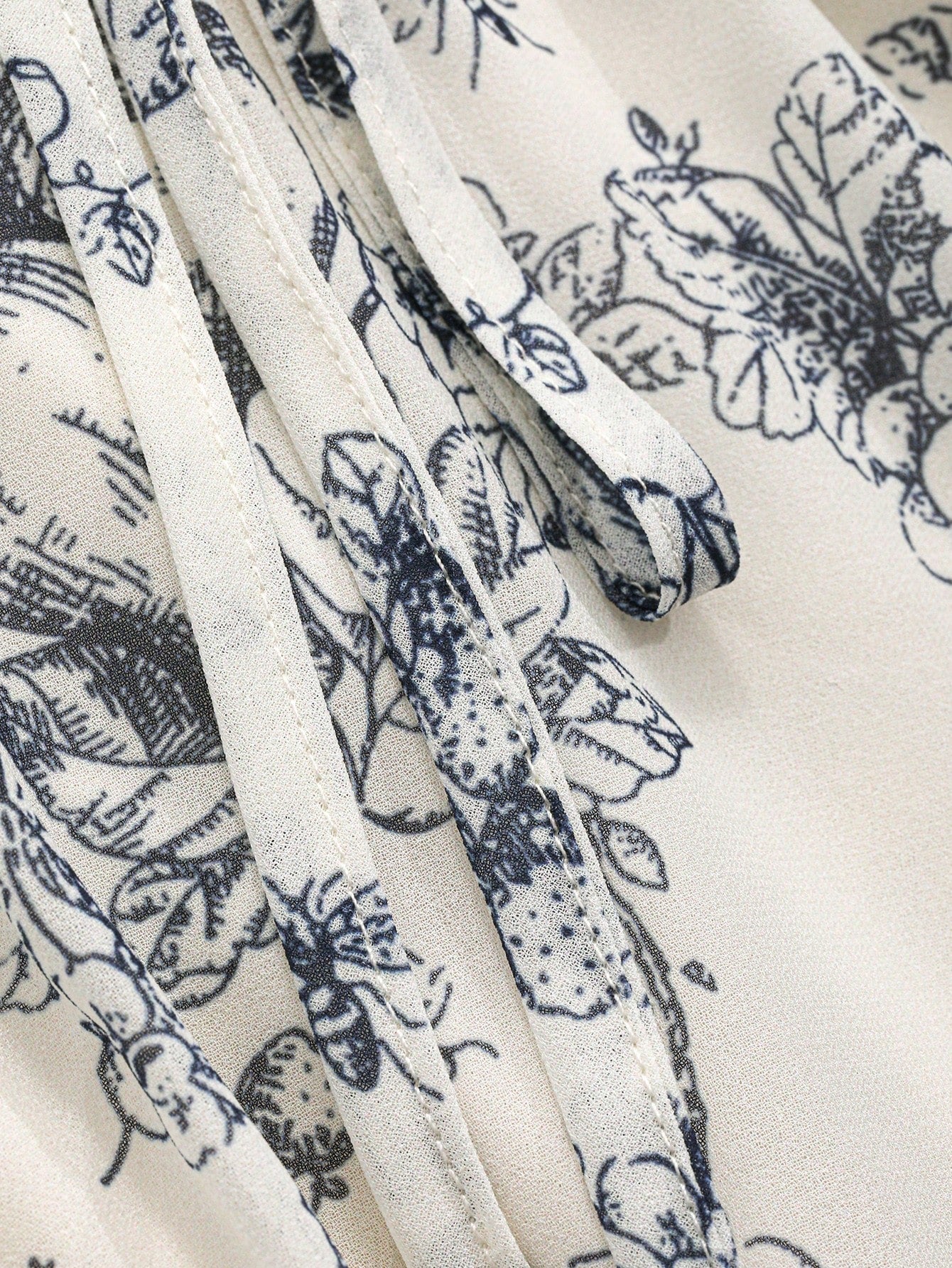 DAZY Allover Floral Print Tie Neck Lantern Sleeve Dress