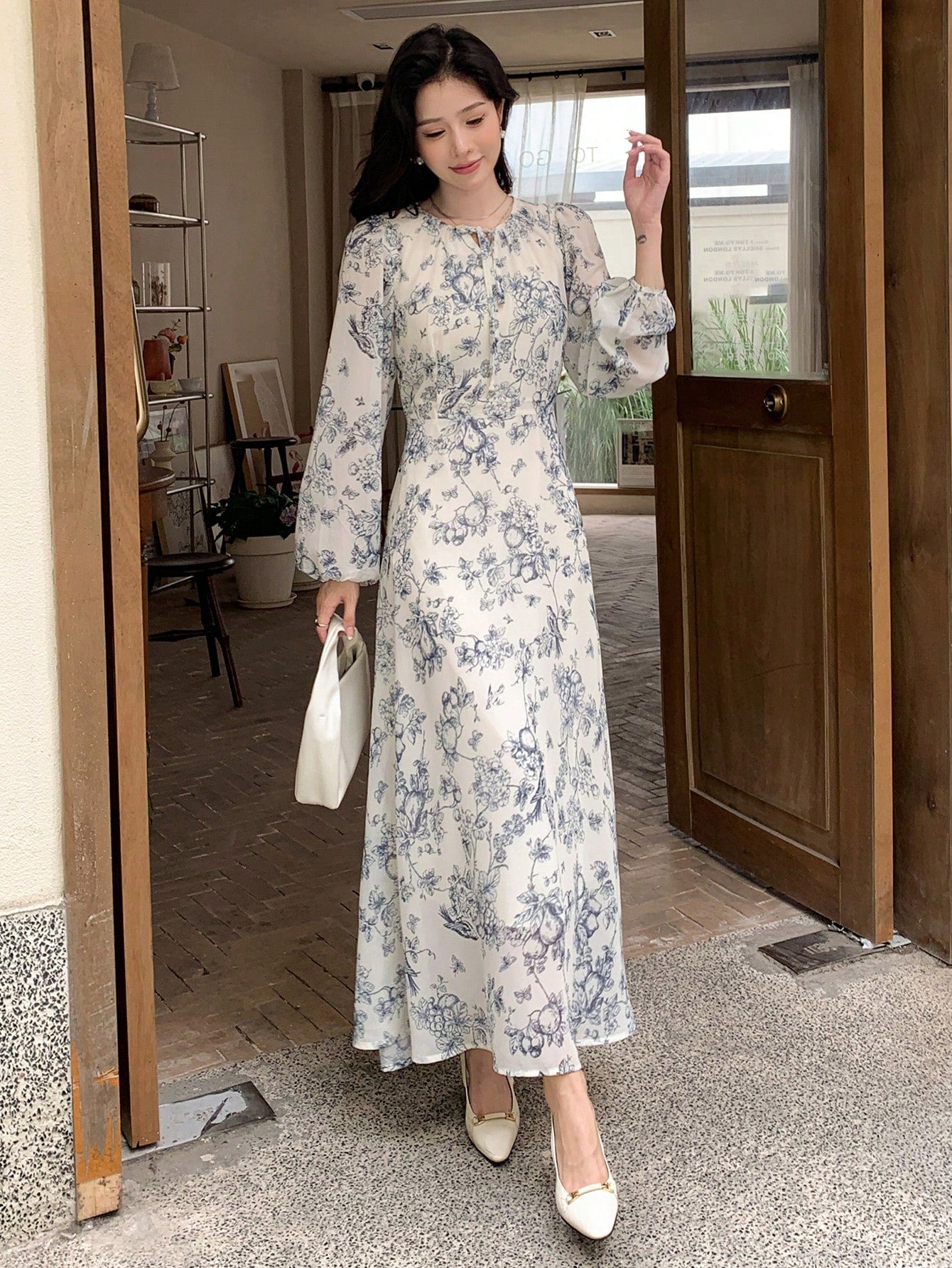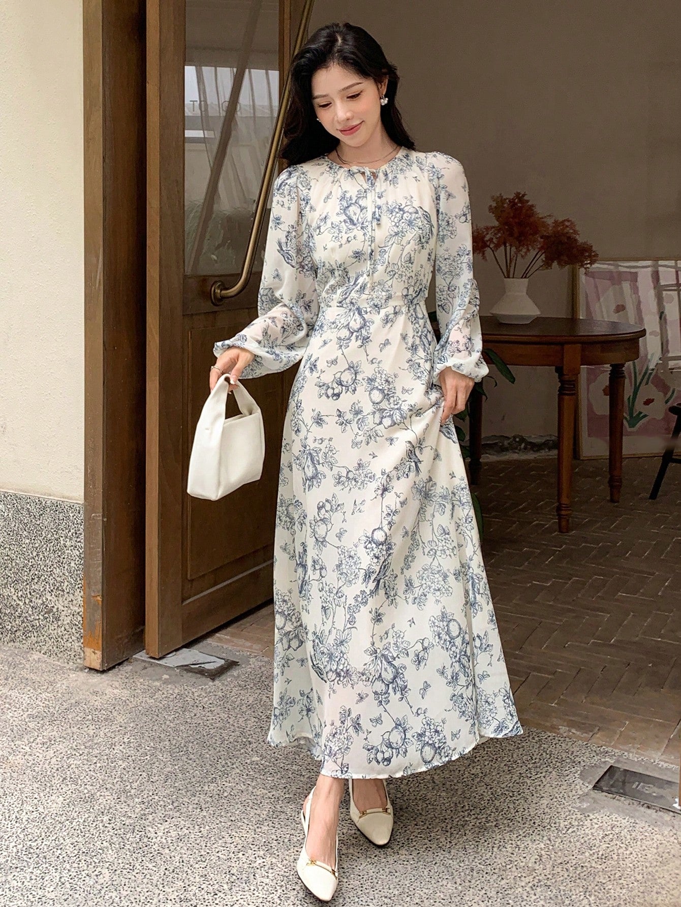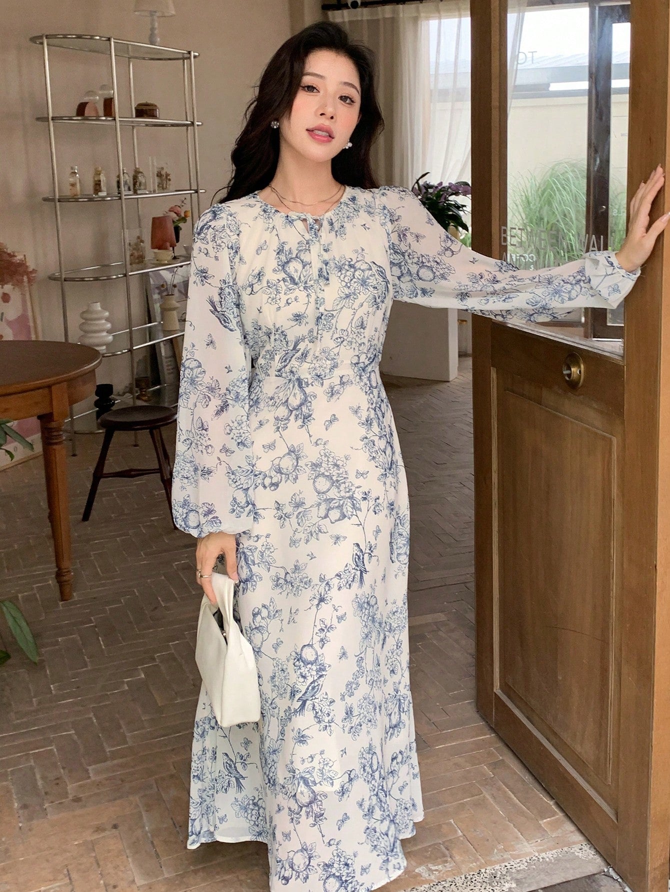 DAZY Allover Floral Print Tie Neck Lantern Sleeve Dress