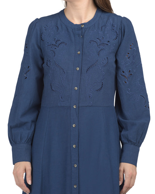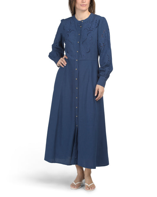 LEA Linen Blend Long Sleeve Embroidered Maxi Dress