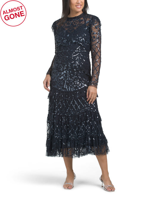 MAC DUGGAL Long Sleeve Beaded Tea Length Dress
