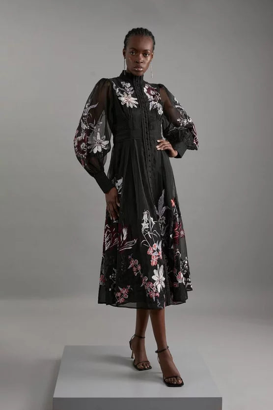 Petite Premium Embroidered Beaded Organdie Woven Maxi Dress