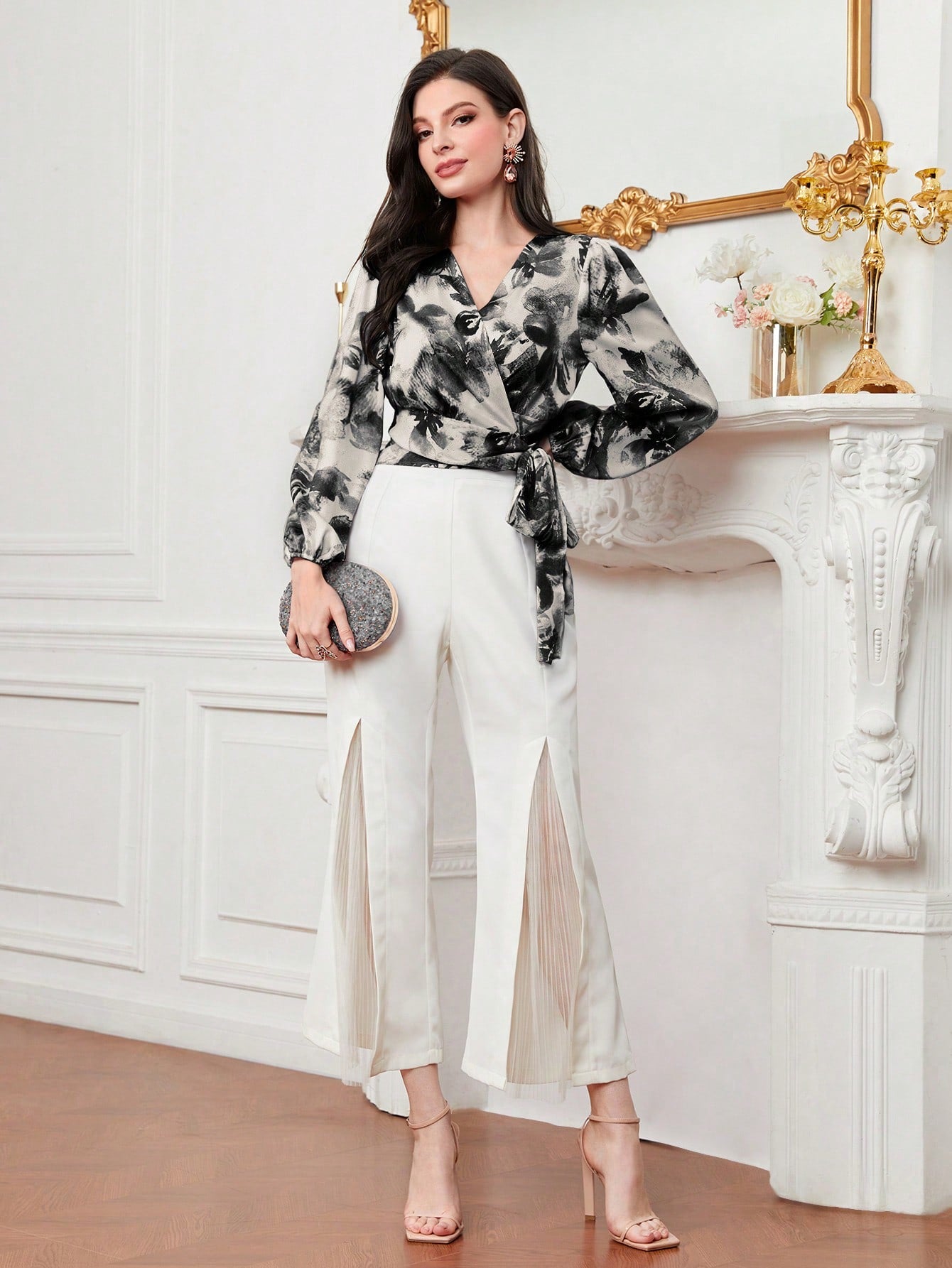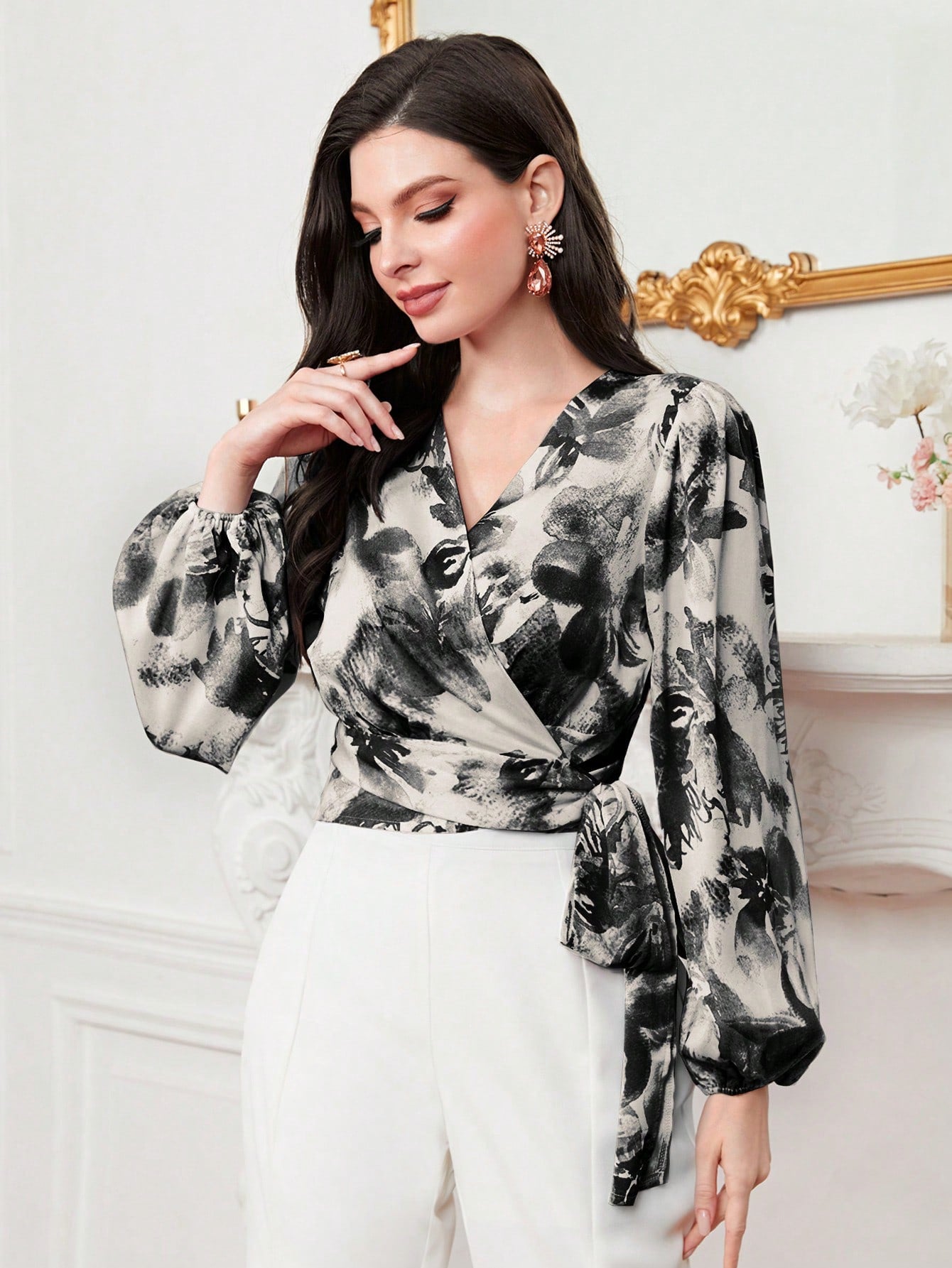 SHEIN Modely Tie Dye Lantern Sleeve Knot Side Wrap Blouse