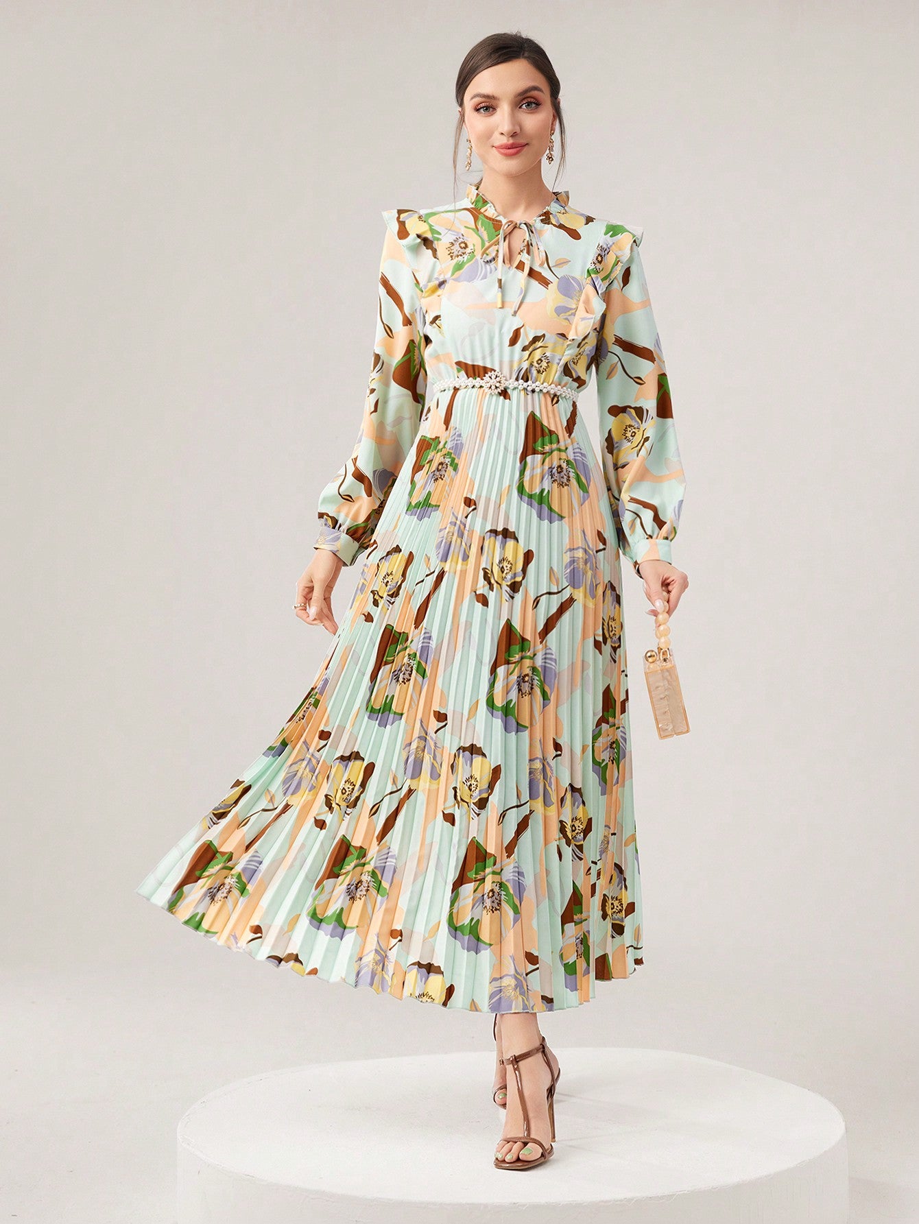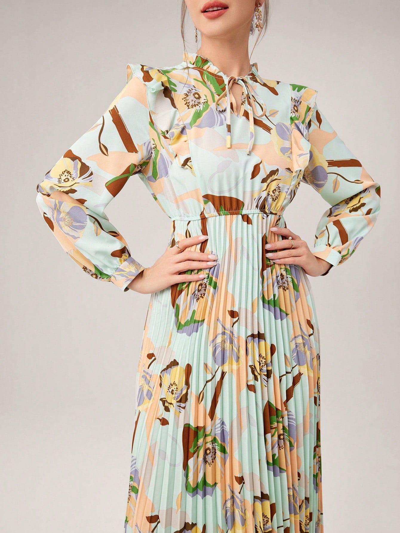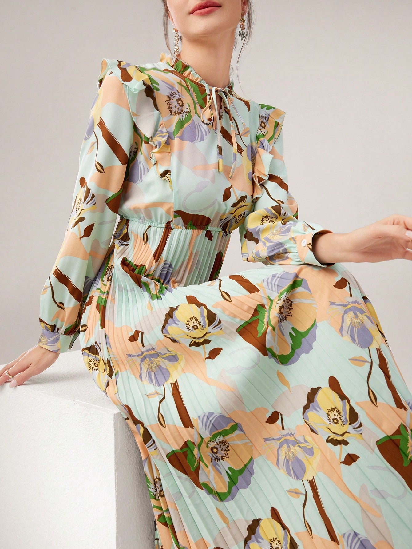 SHEIN Mulvari Women's Elegant Pleated Long Sleeve Floral Print Tie Neck Dress With Ruffle Hem, Spring/Summer