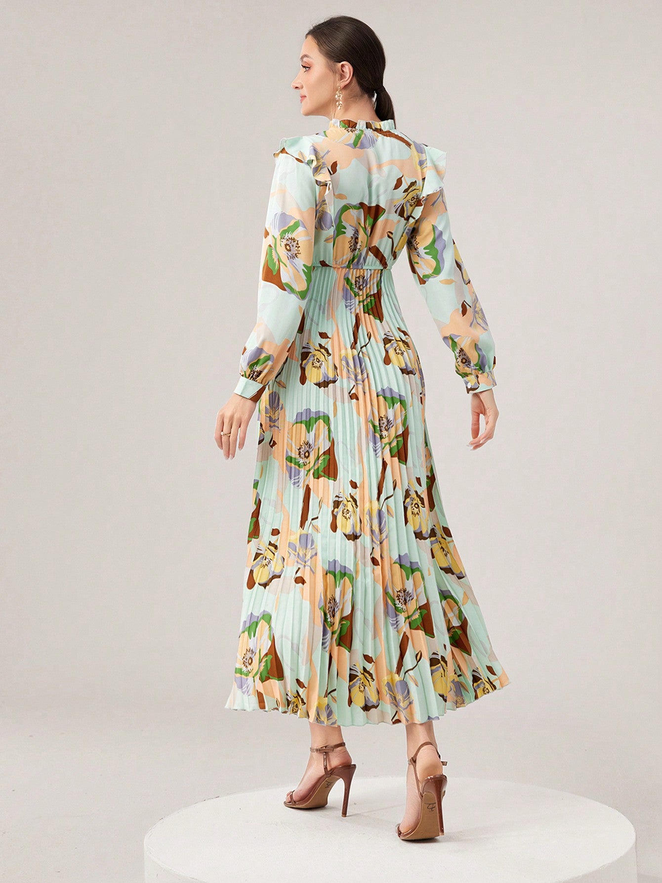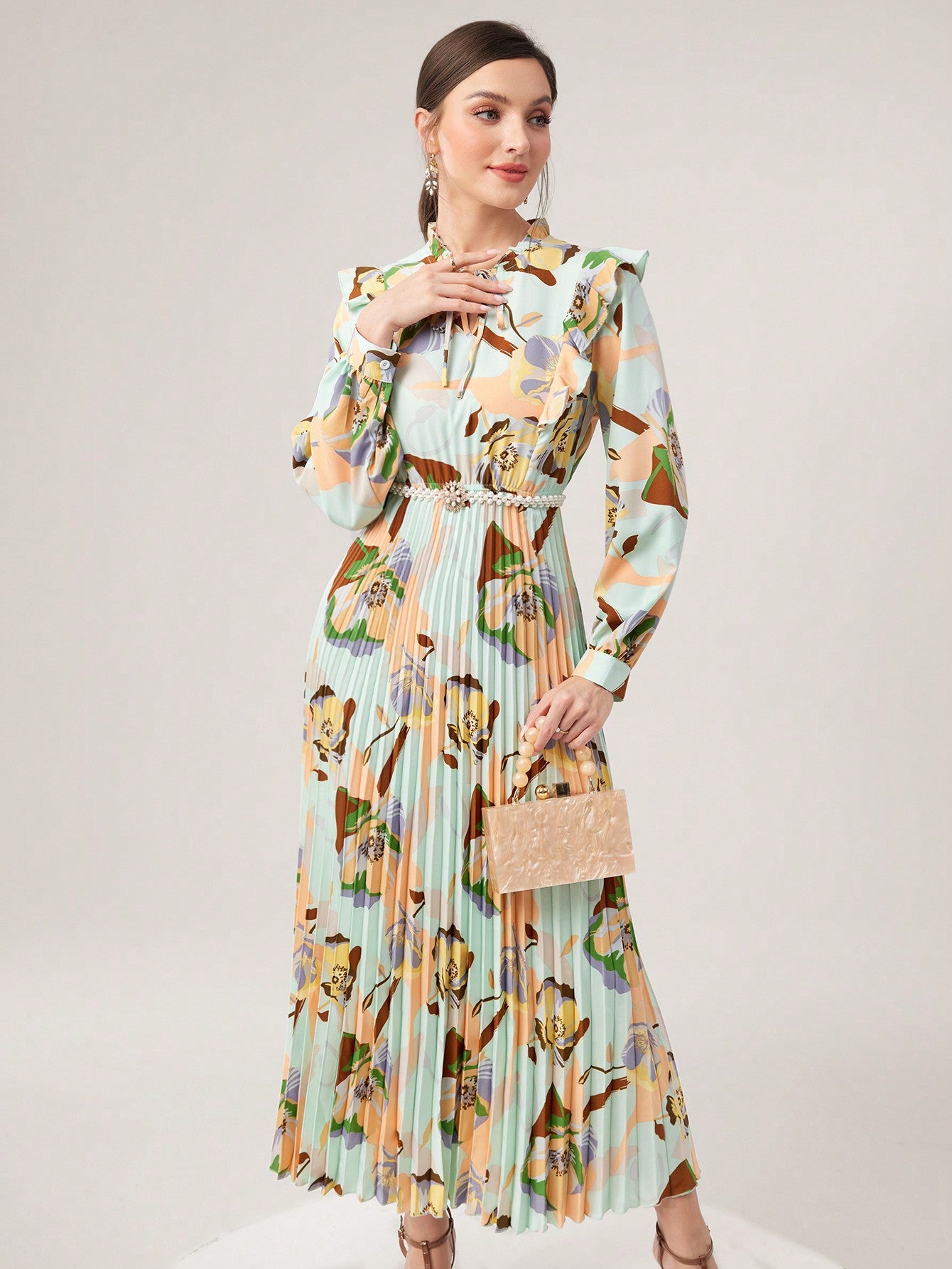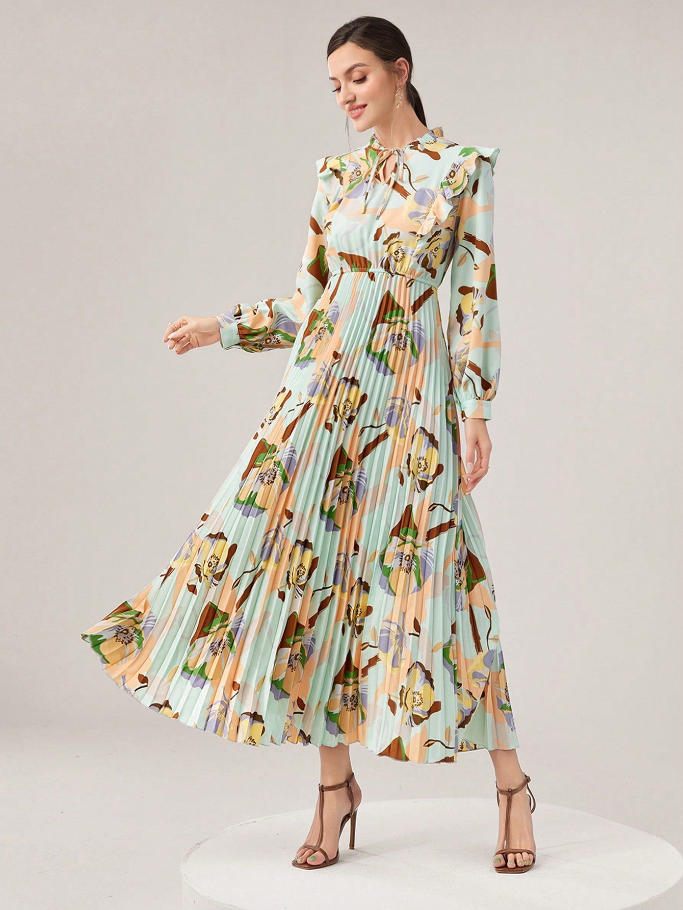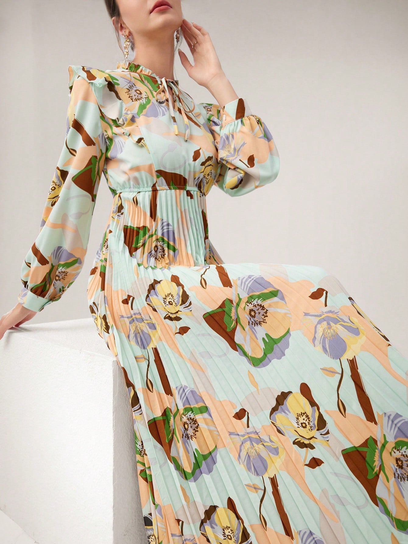SHEIN Mulvari Women's Elegant Pleated Long Sleeve Floral Print Tie Neck Dress With Ruffle Hem, Spring/Summer