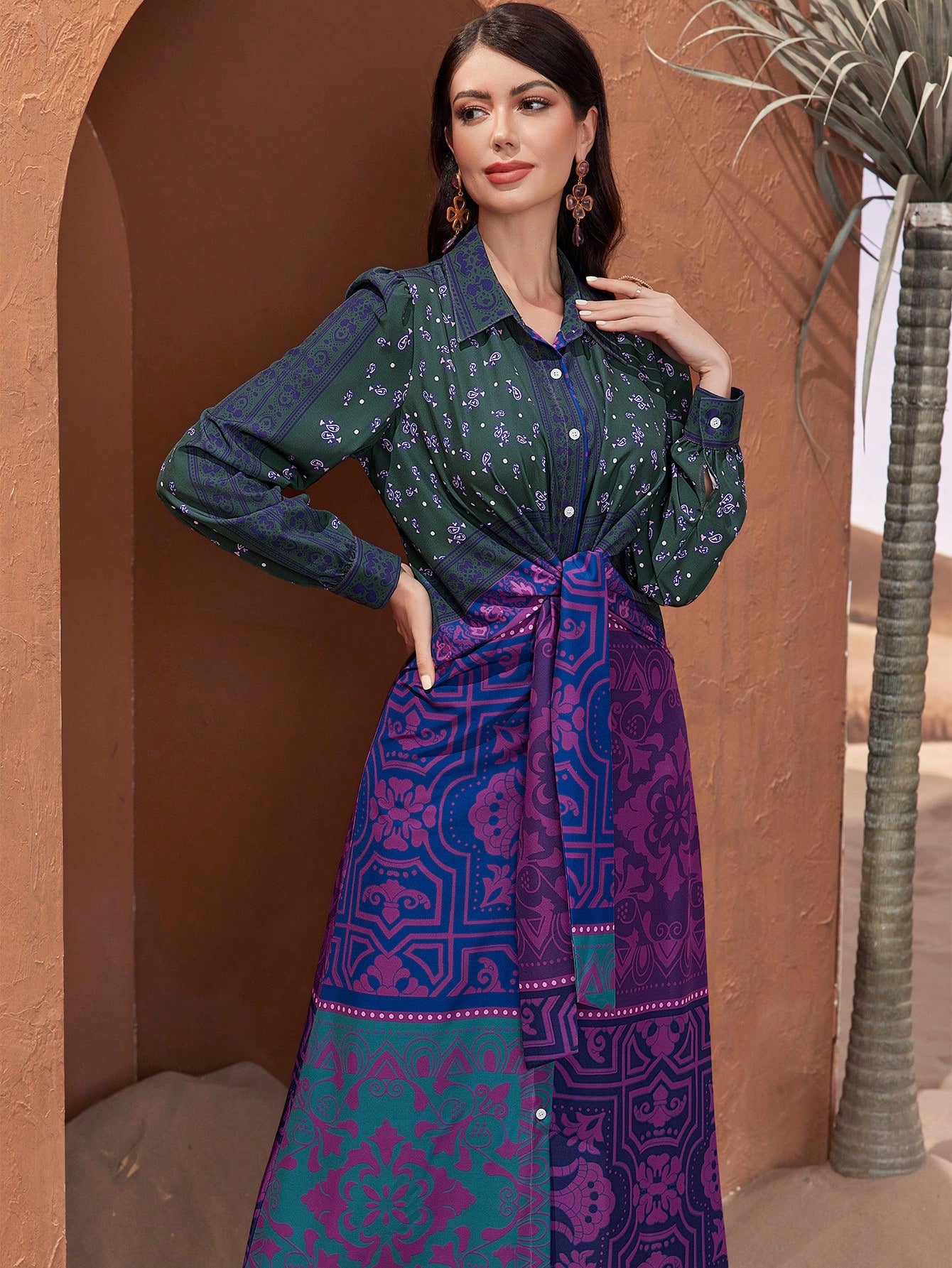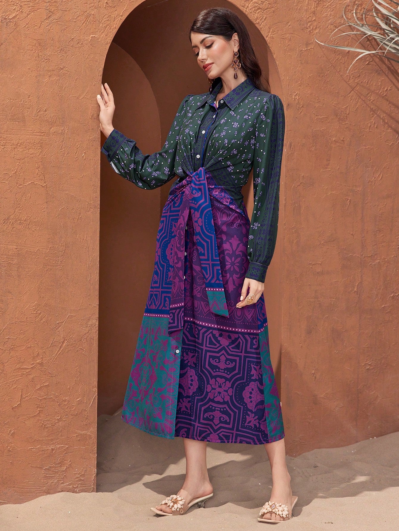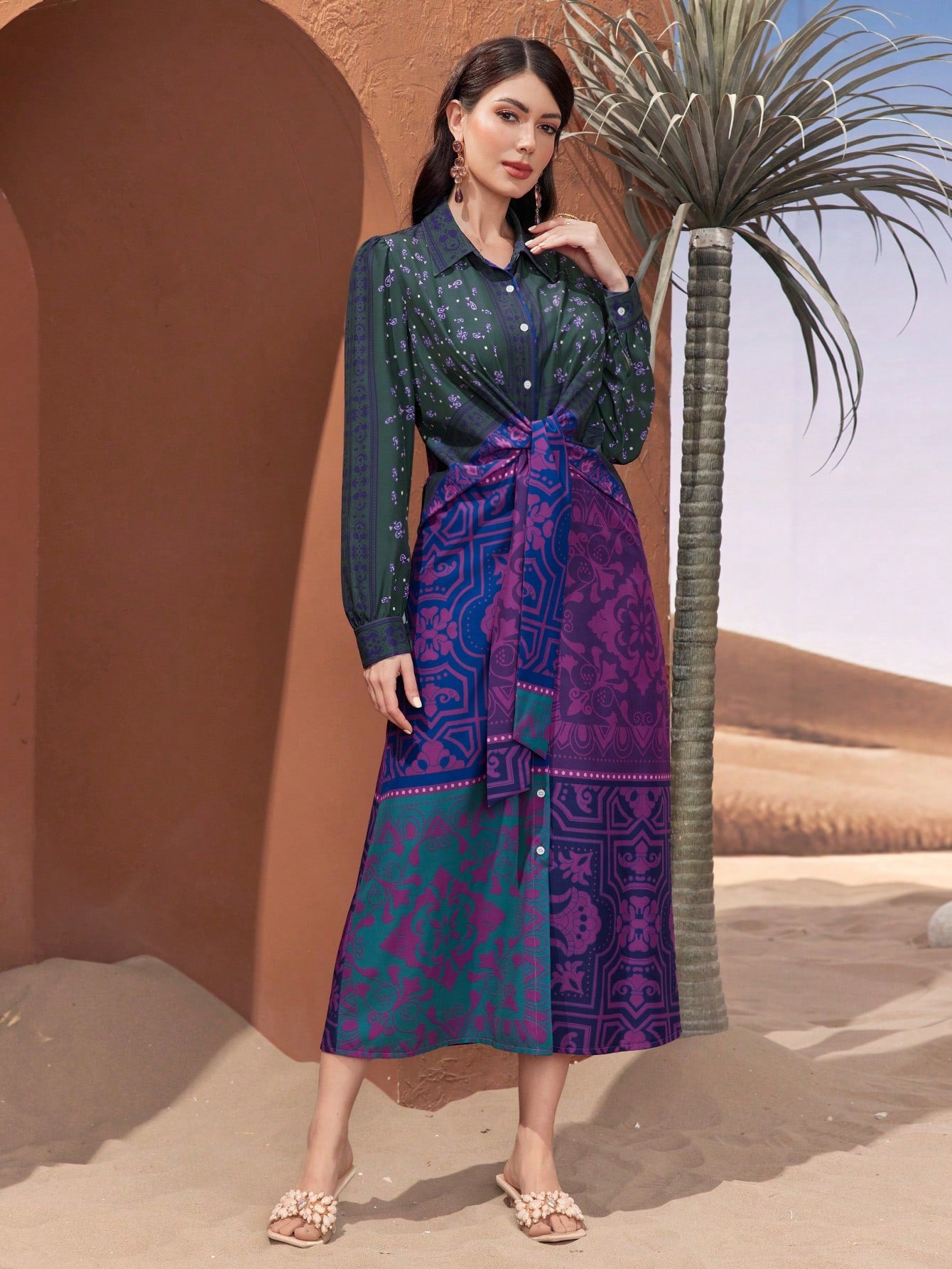 SHEIN Mulvari Women's Floral Print Waist Tie Long Sleeve Midi Dress