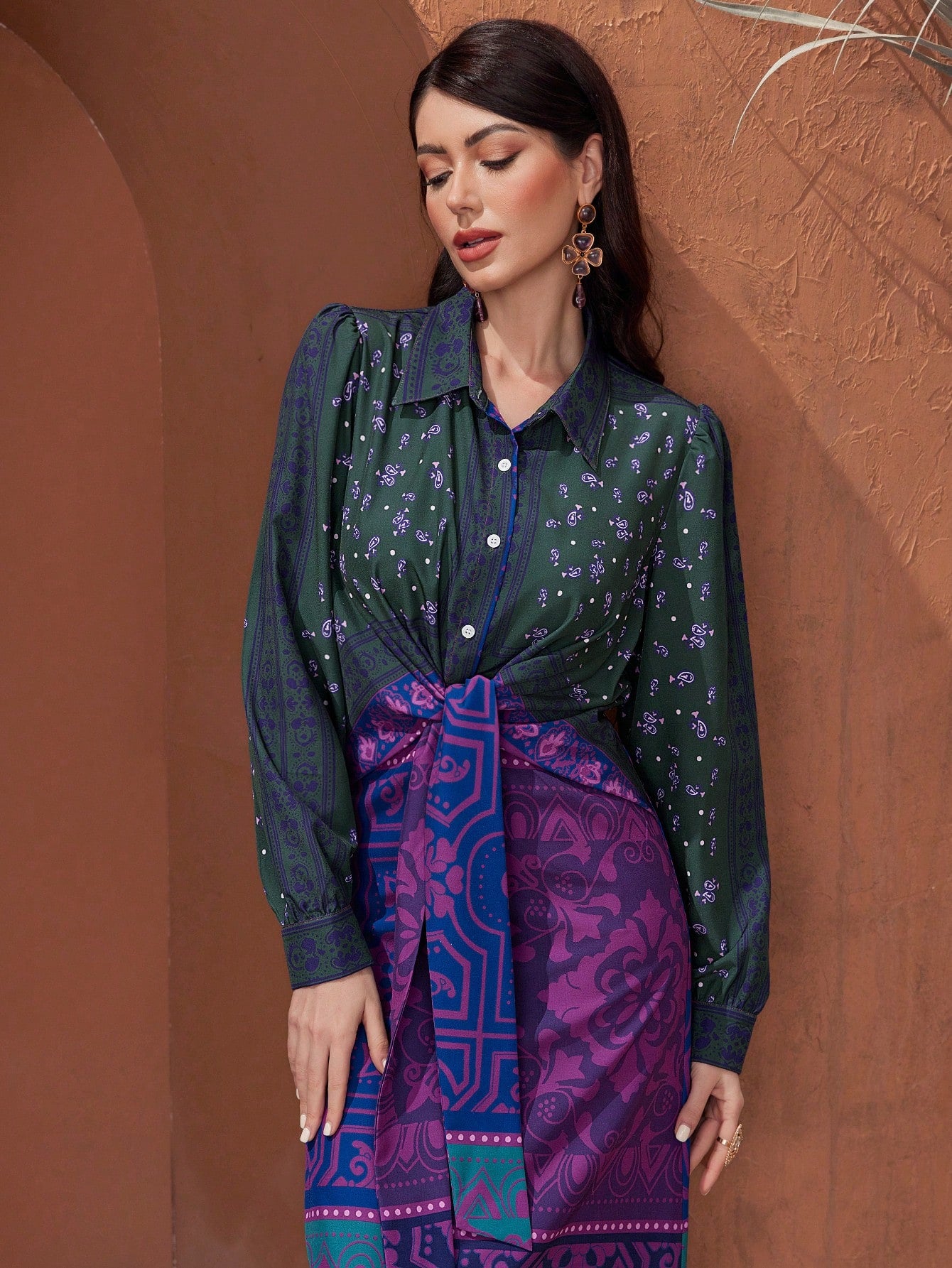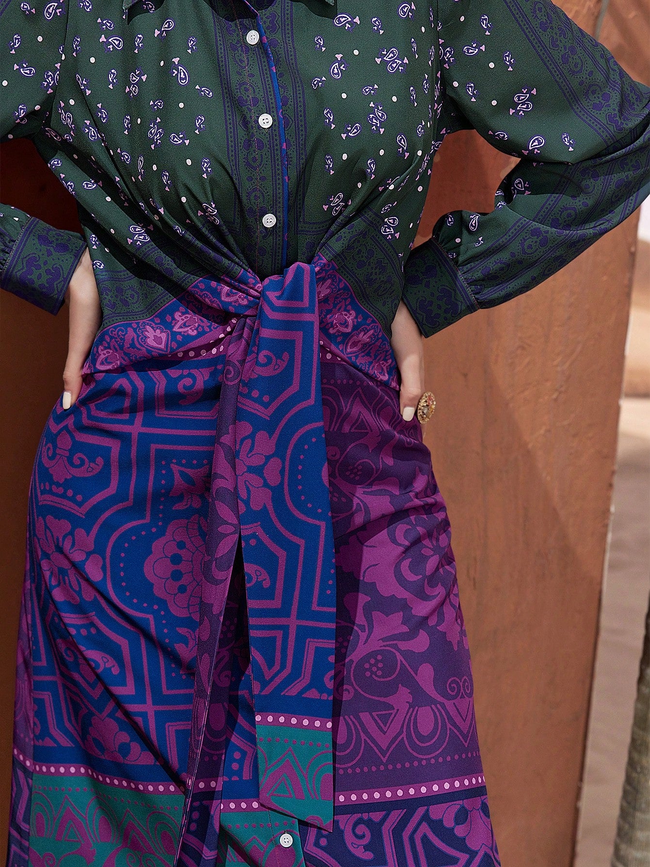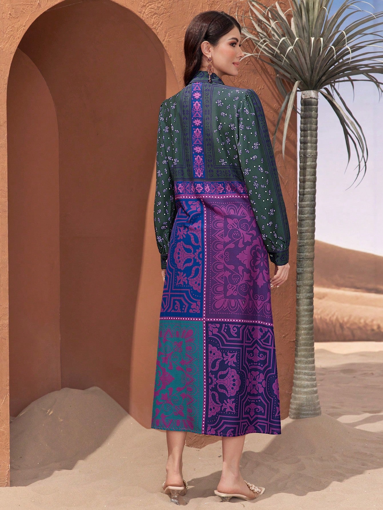SHEIN Mulvari Women's Floral Print Waist Tie Long Sleeve Midi Dress
