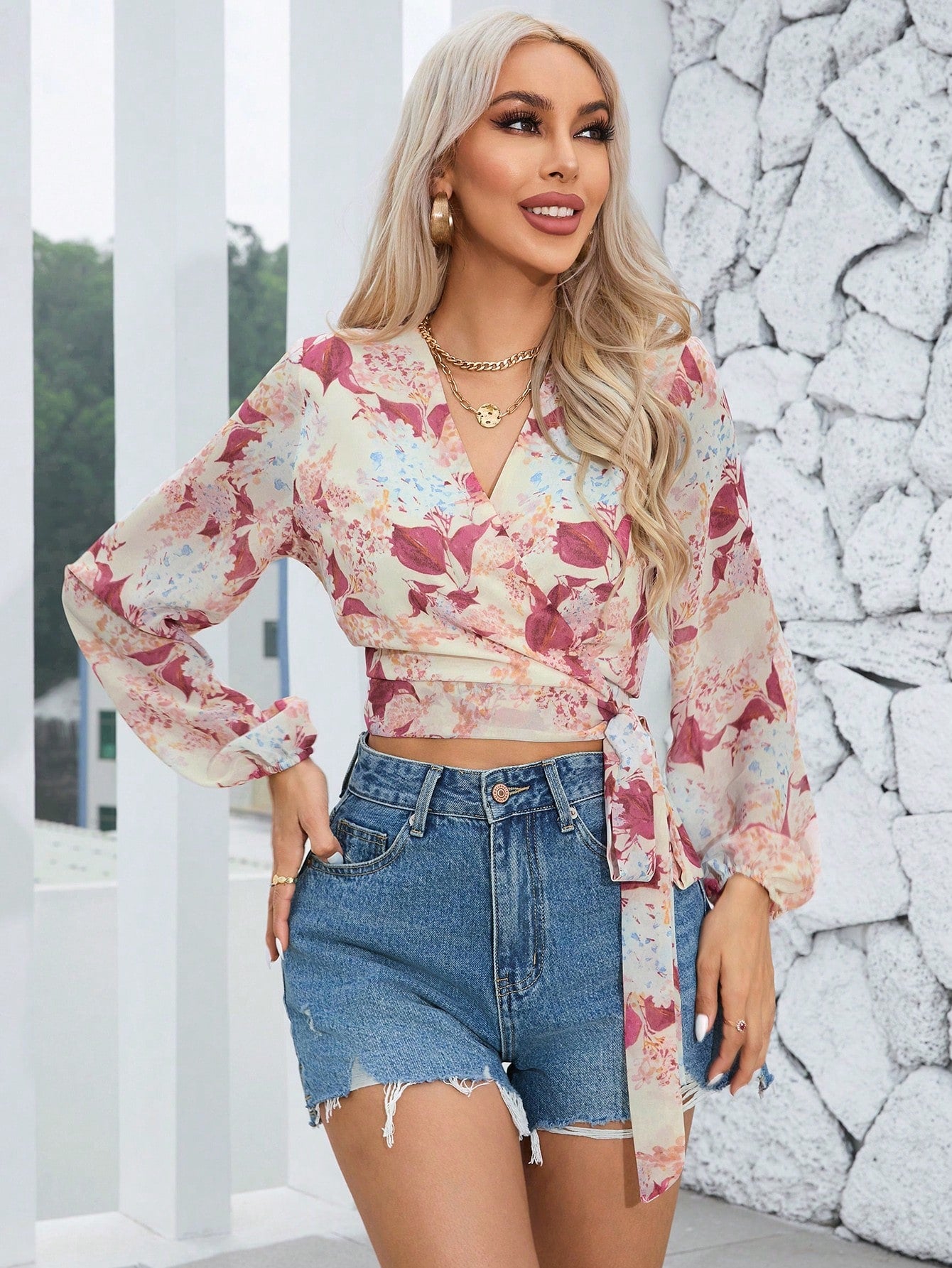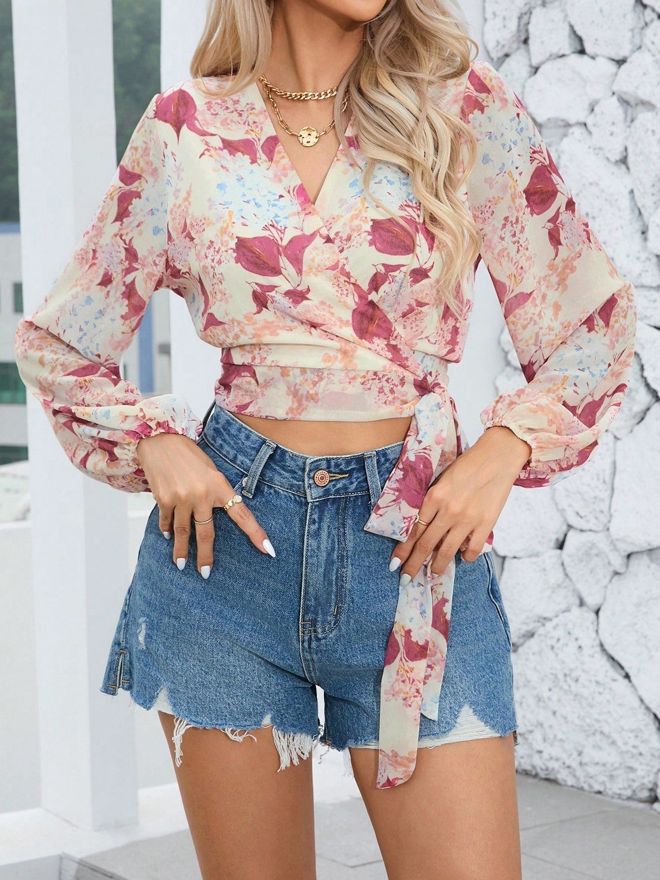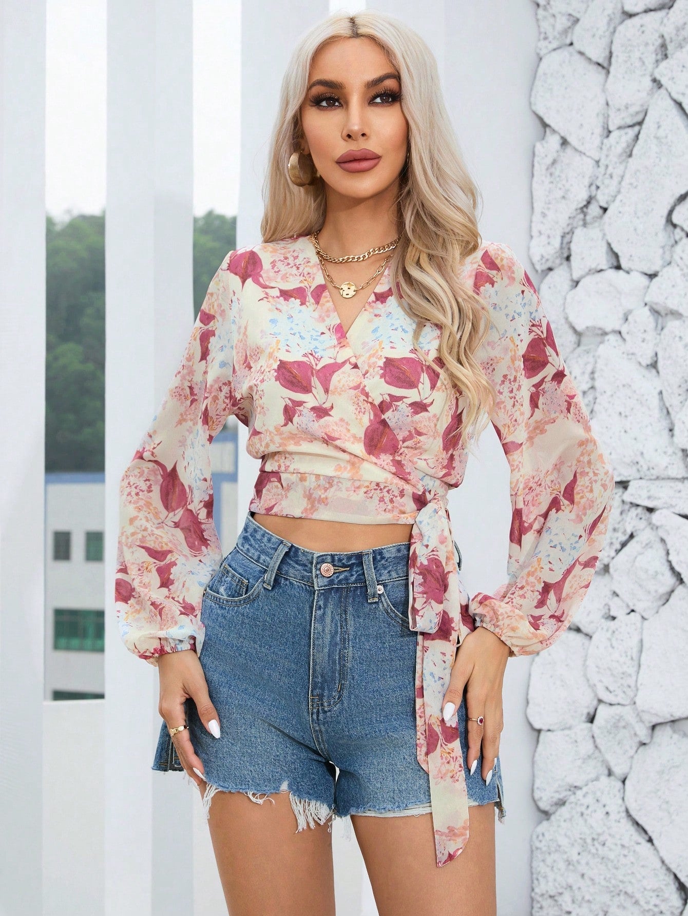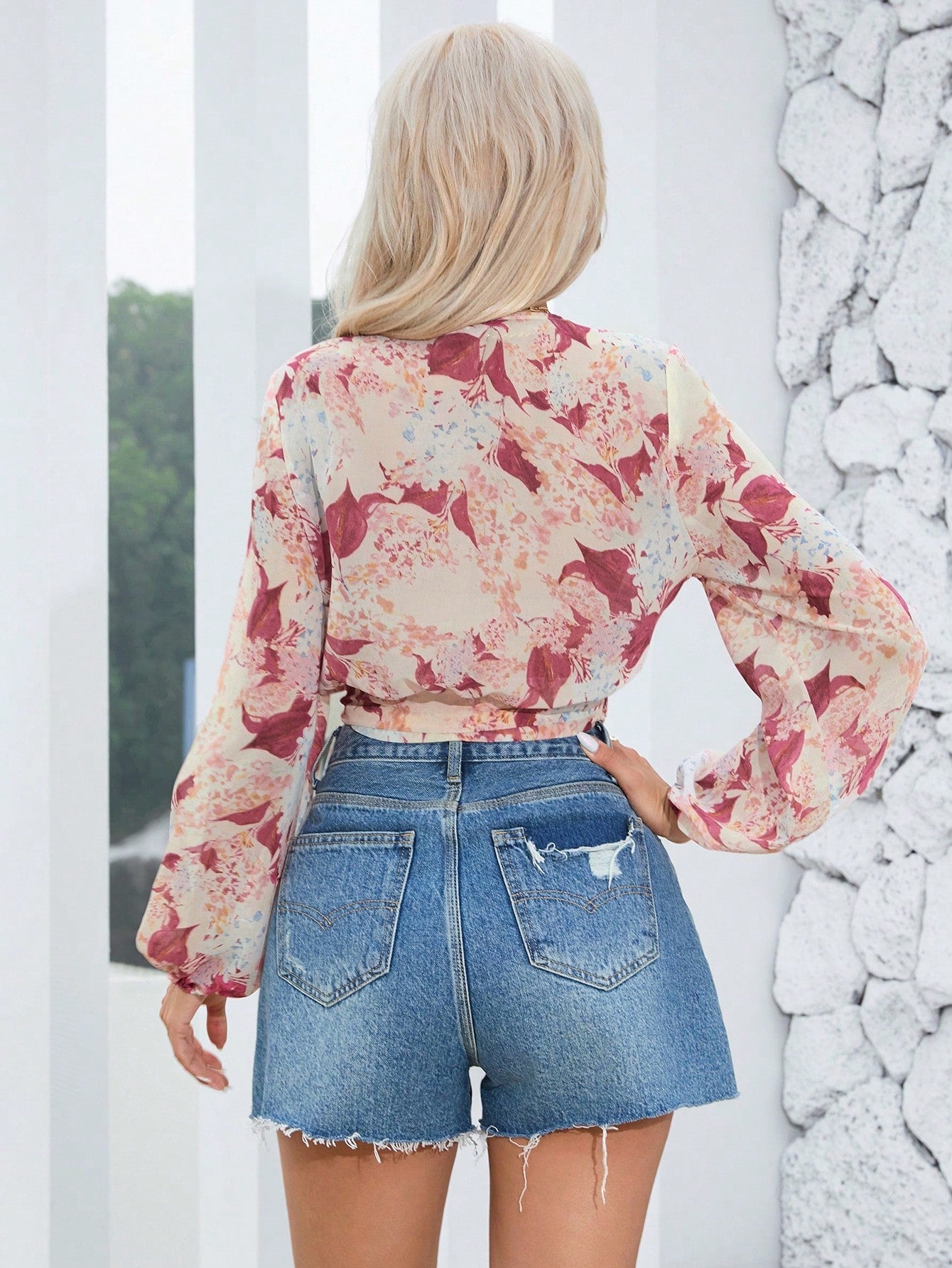 SHEIN Privé Women's Fashion Long Sleeve Blouse With Random Print, V-Neck And Tie Details