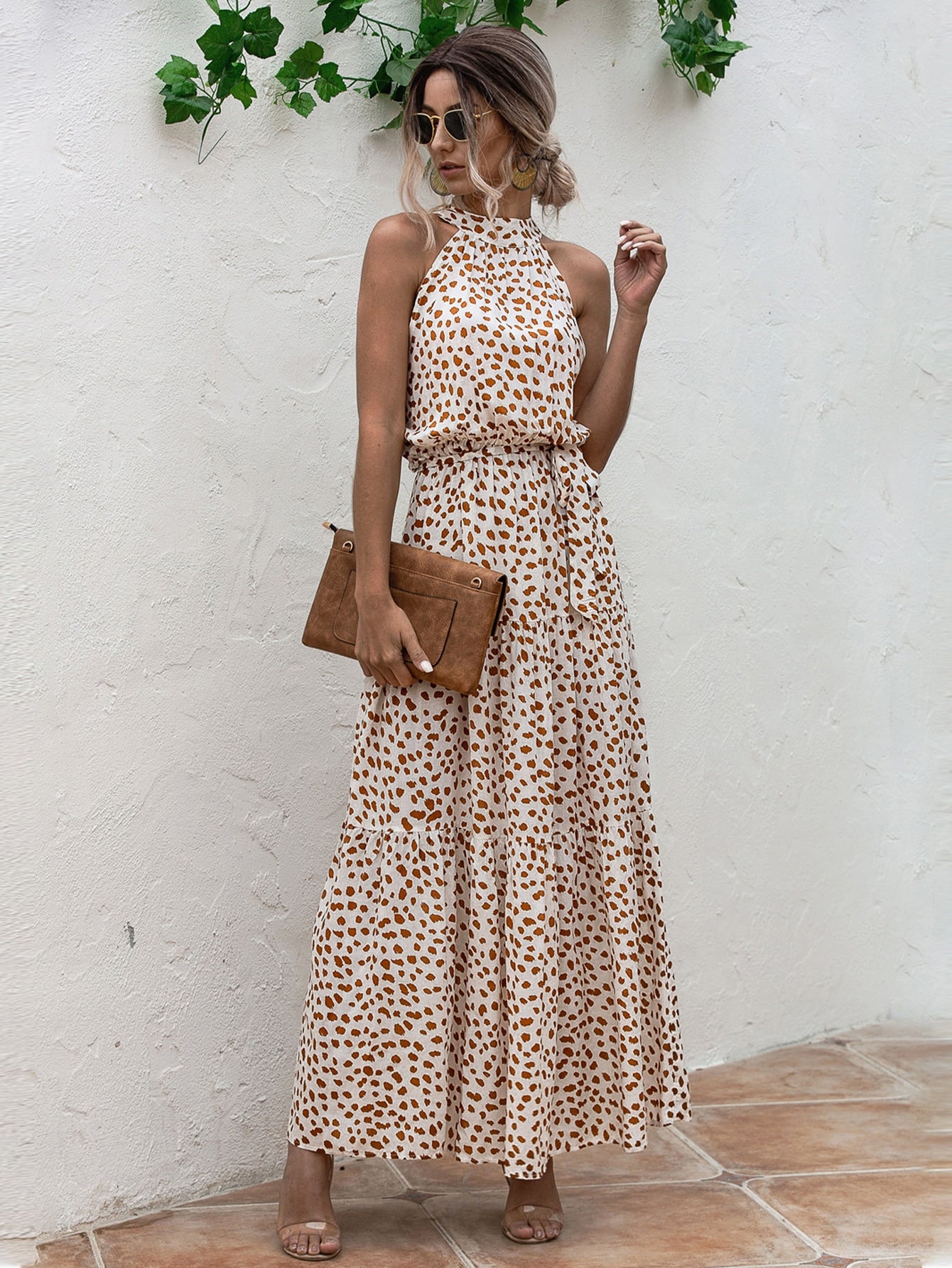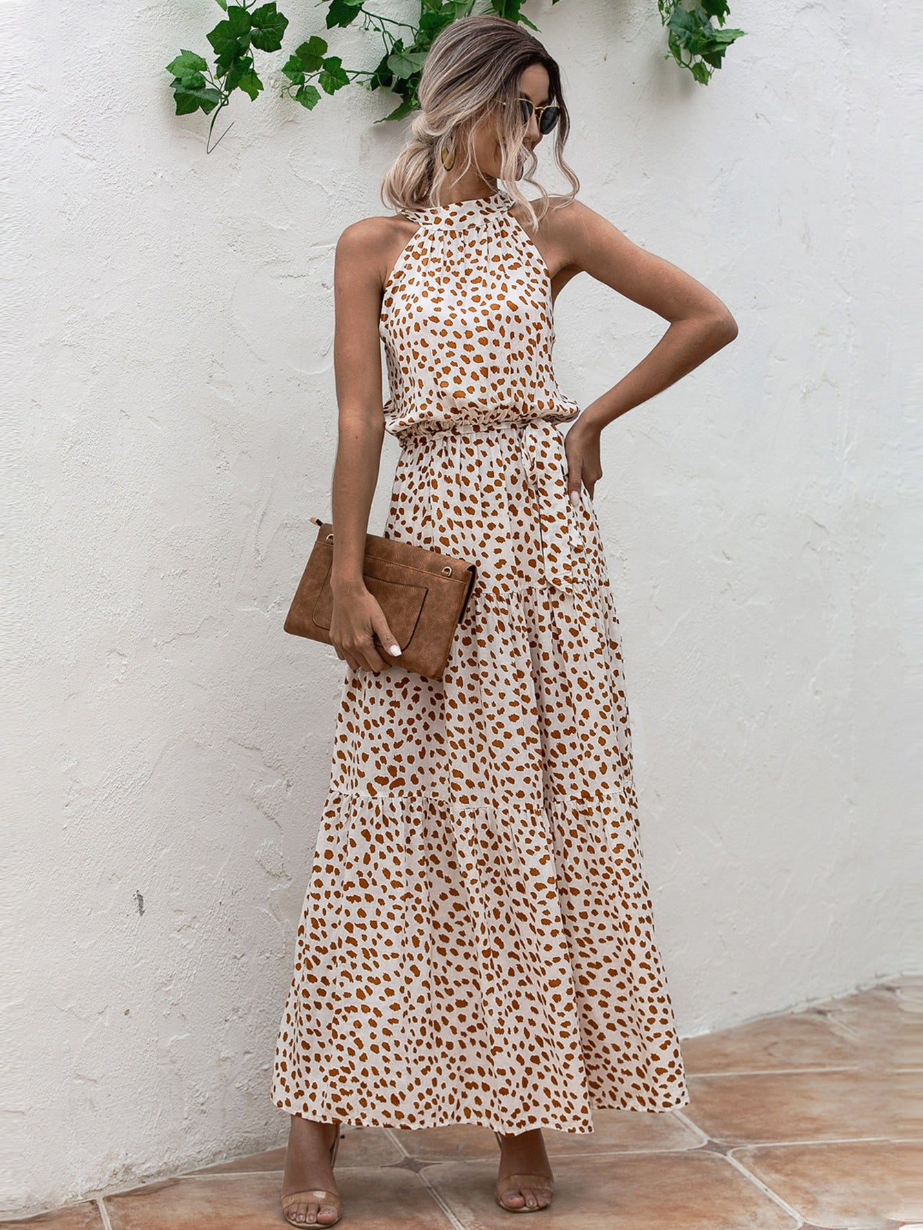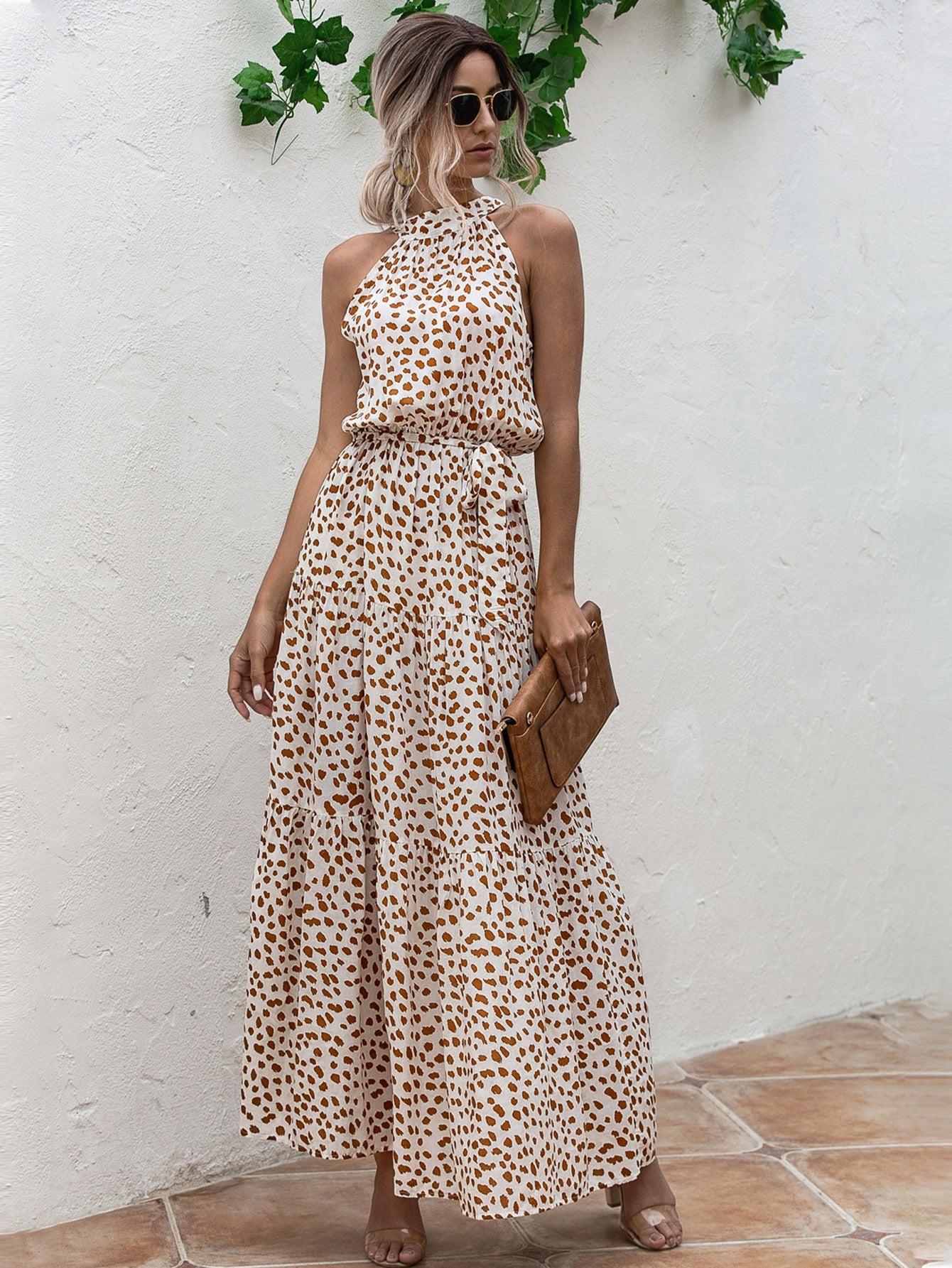 SHEIN VCAY Allover Print Layered Hem Belted Halter Dress