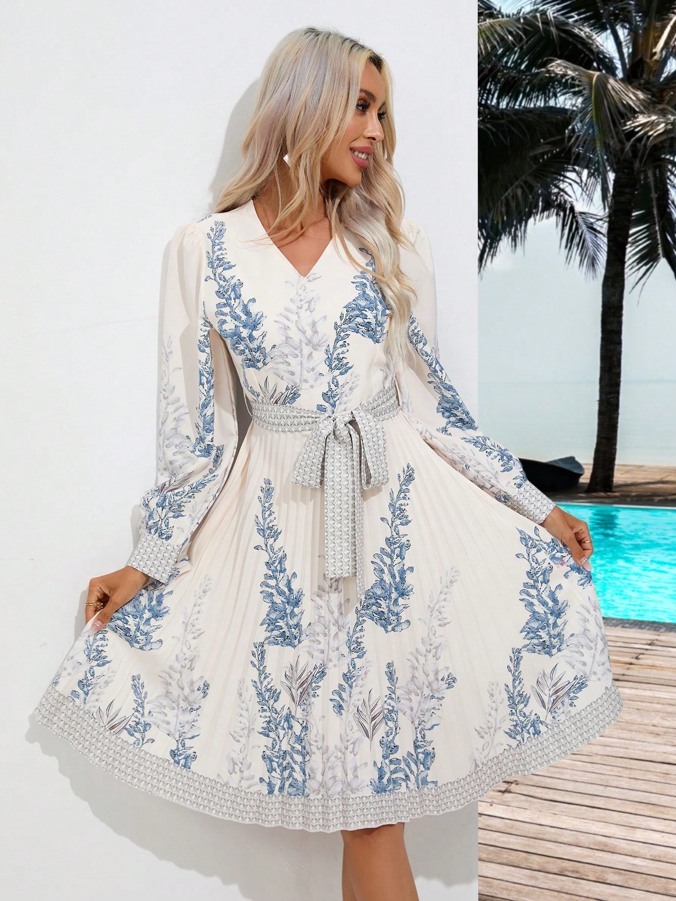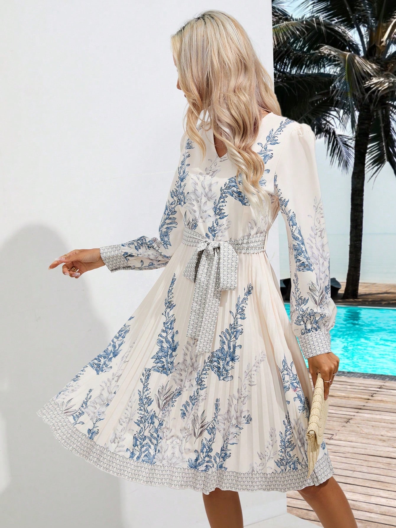 SHEIN VCAY Floral Print Pleated Hem Belted Dress