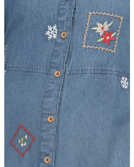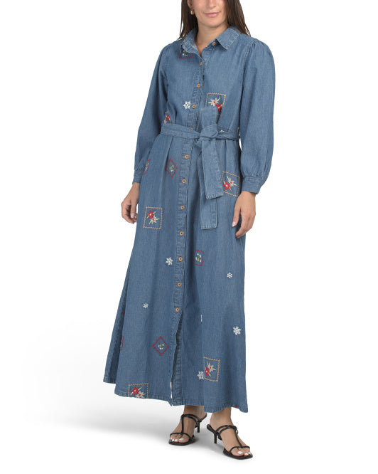 SOLITAIRE Long Sleeve Embroidered Denim Maxi Dress With Rope Belt