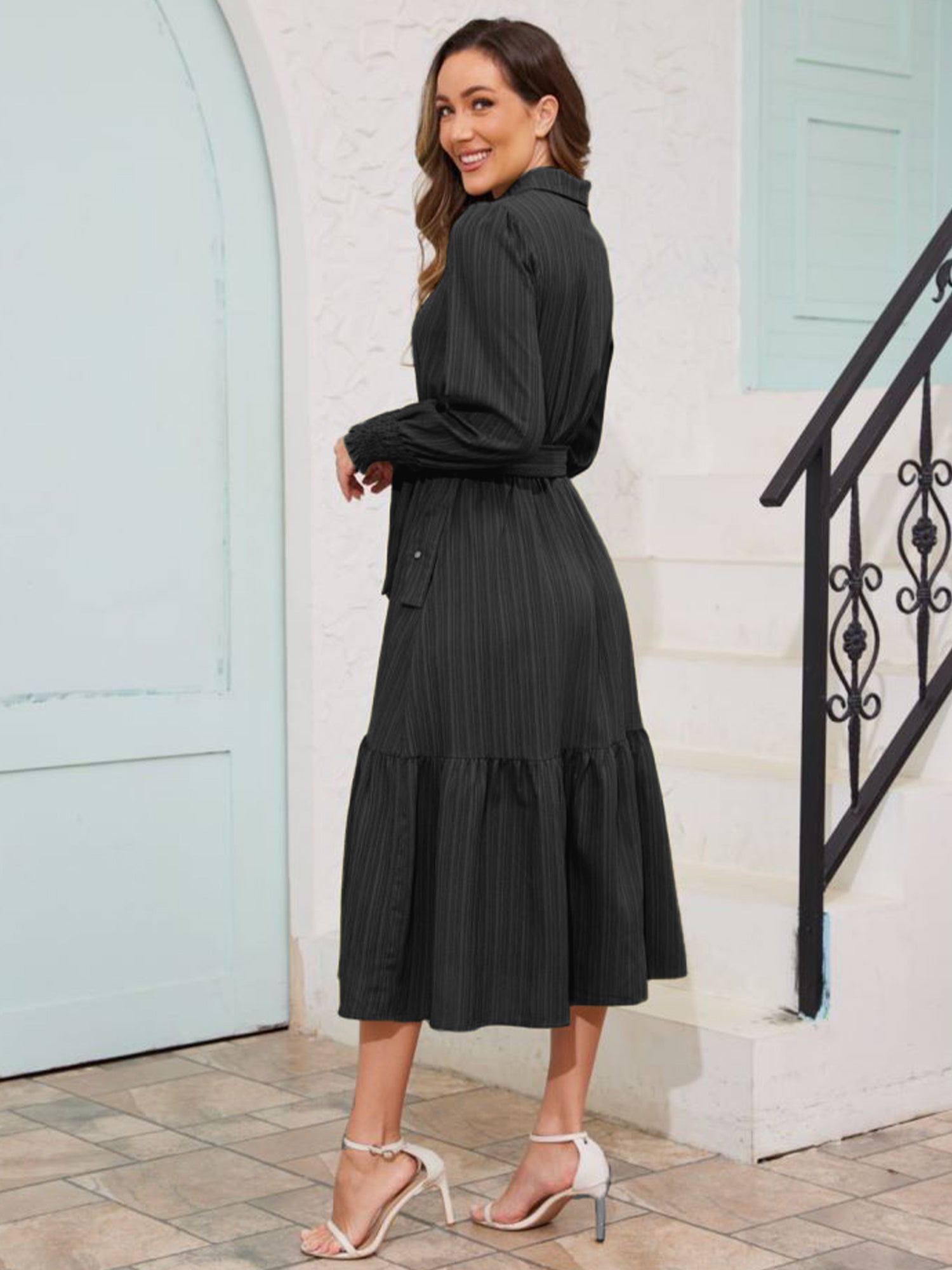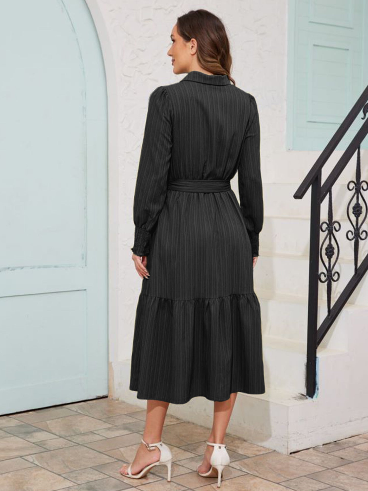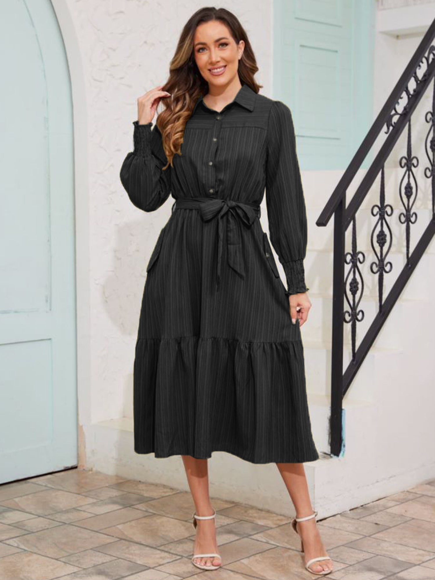 Walmart Frontwalk Fall Dresses For Women 2024 Lapel Neck Button Long Sleeve Dress Belted A-Line Flowy Rufflee Maxi Shirt Dress Casual Long Sundress Black XL