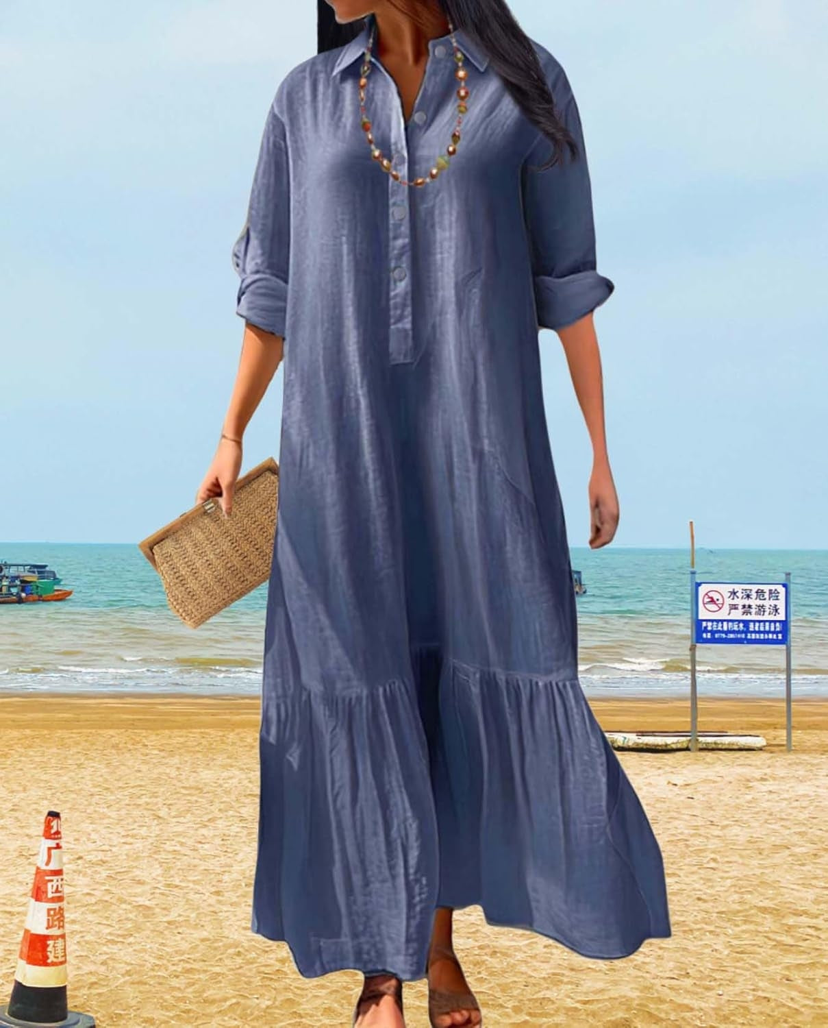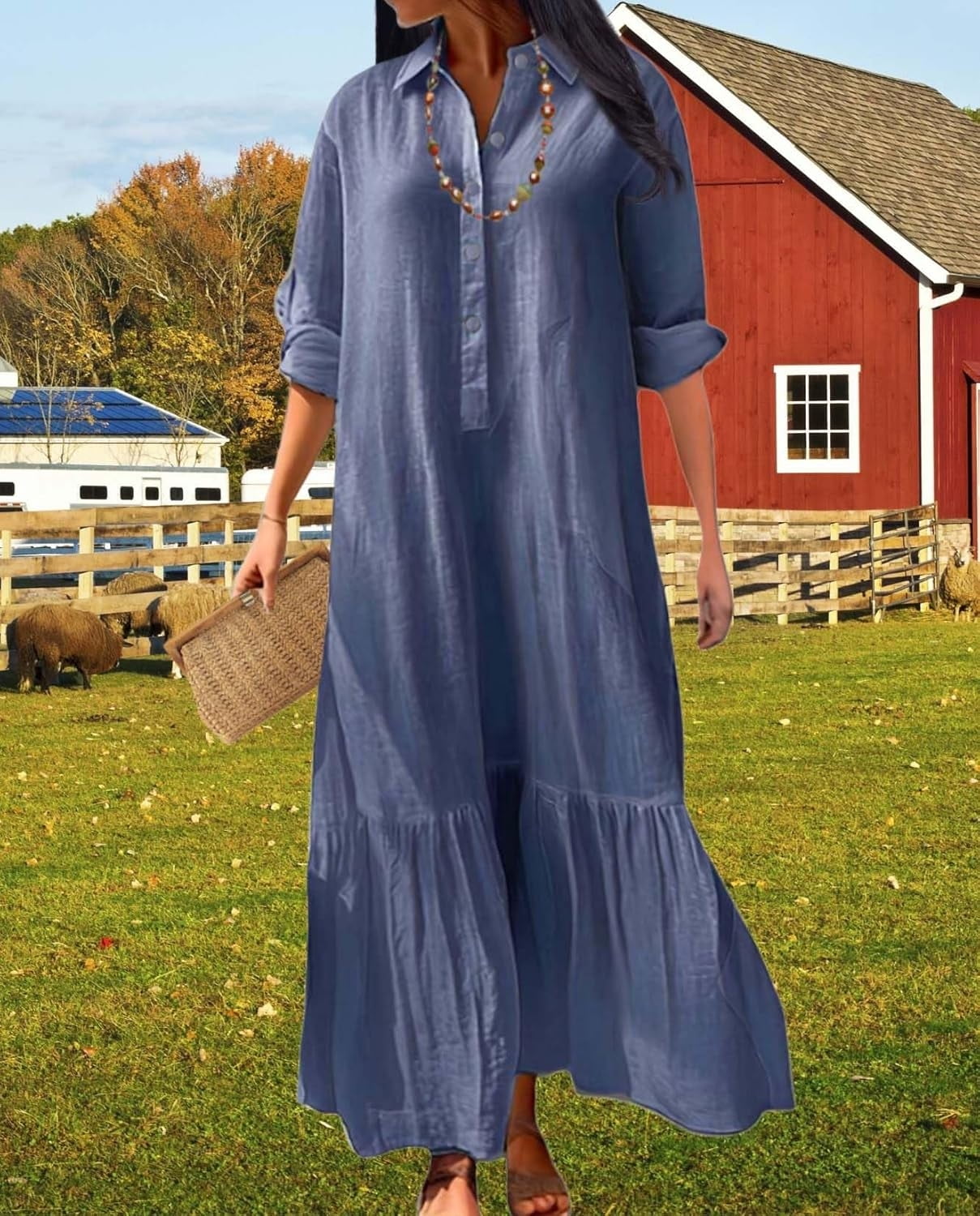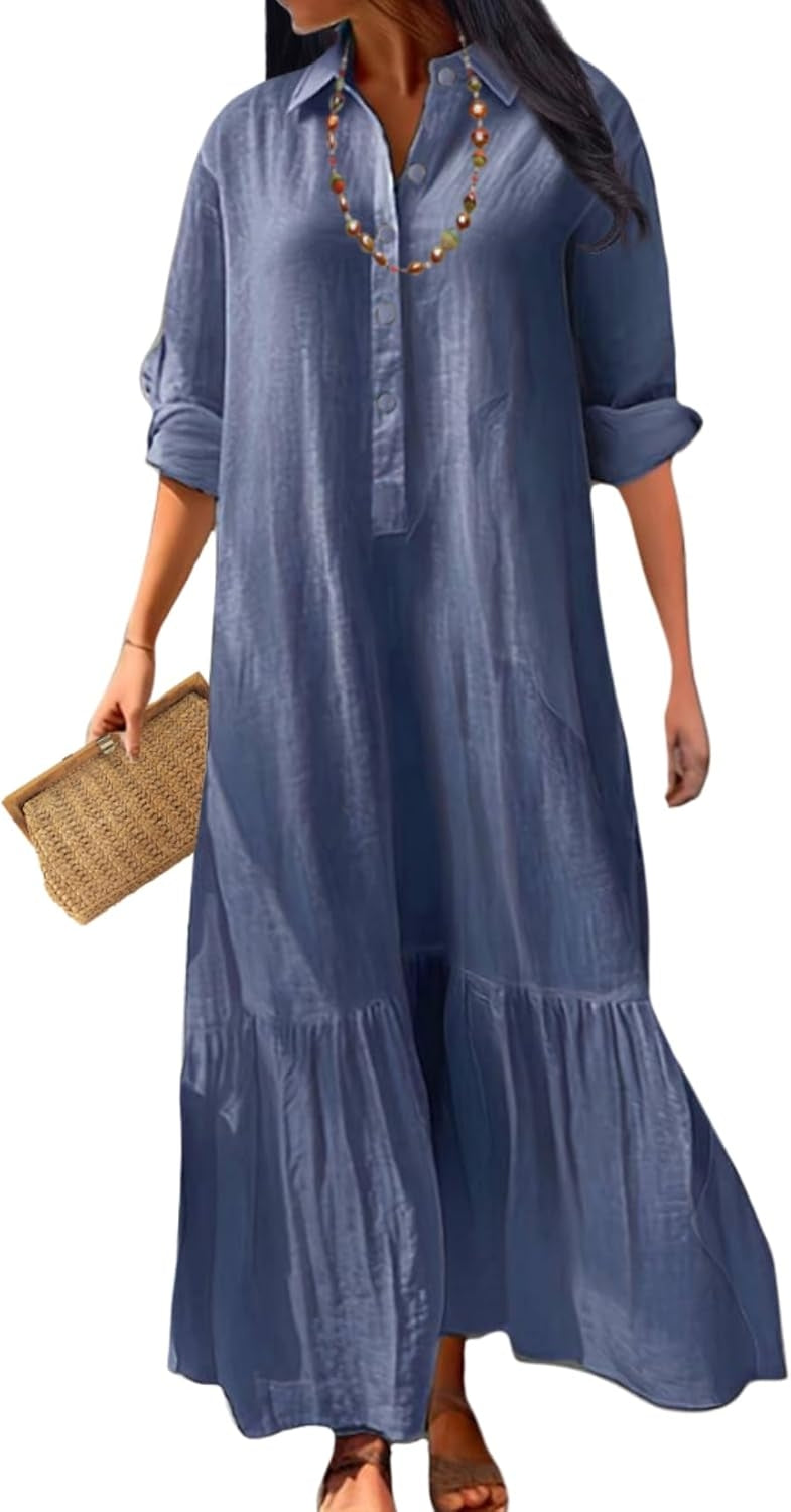 Walmart Womens Cotton Linen Dress Casual Button Down Long Sleeve Flowy Plus Size Lapel Collared Maxi Dresses Shirt Dress